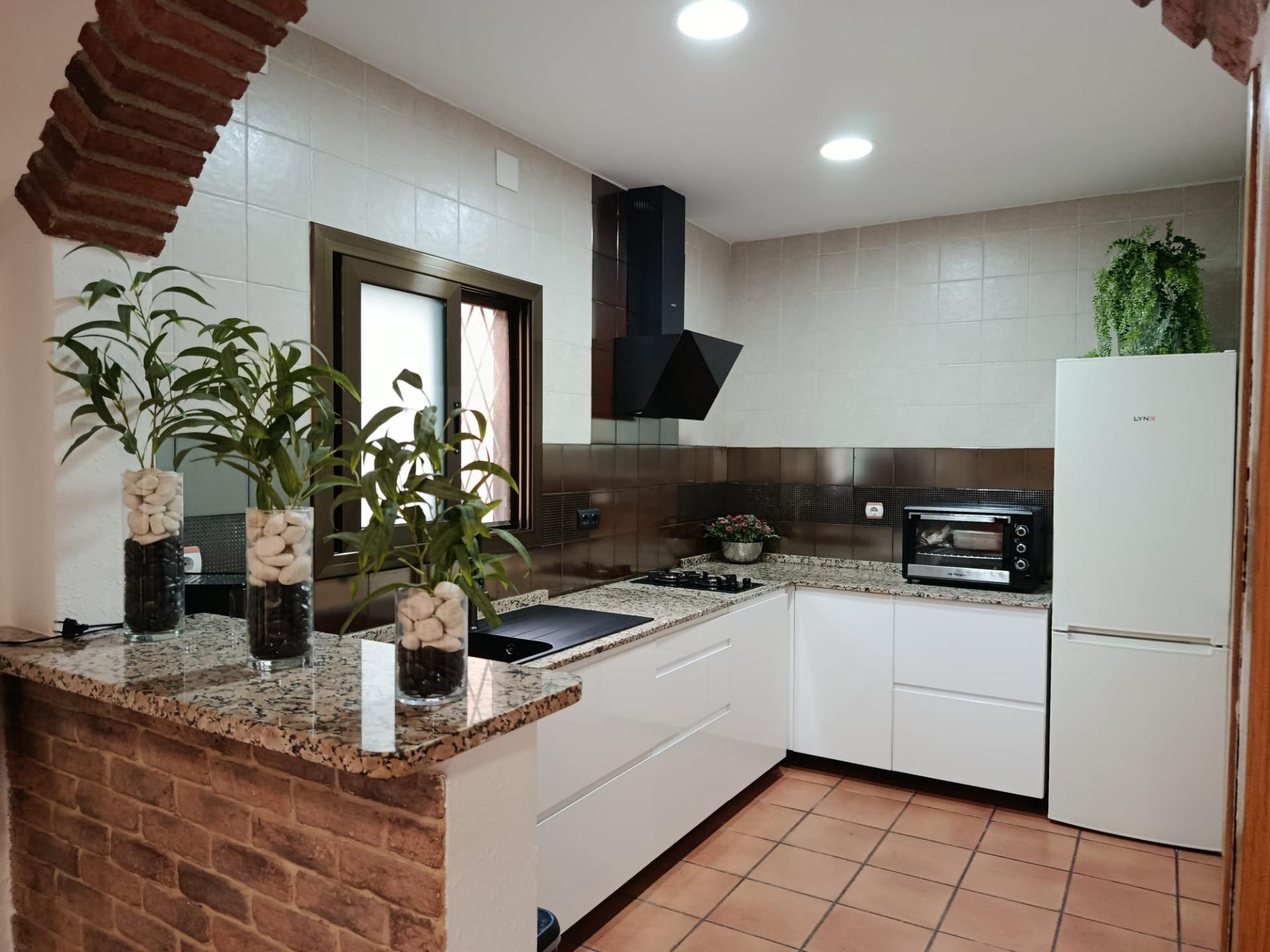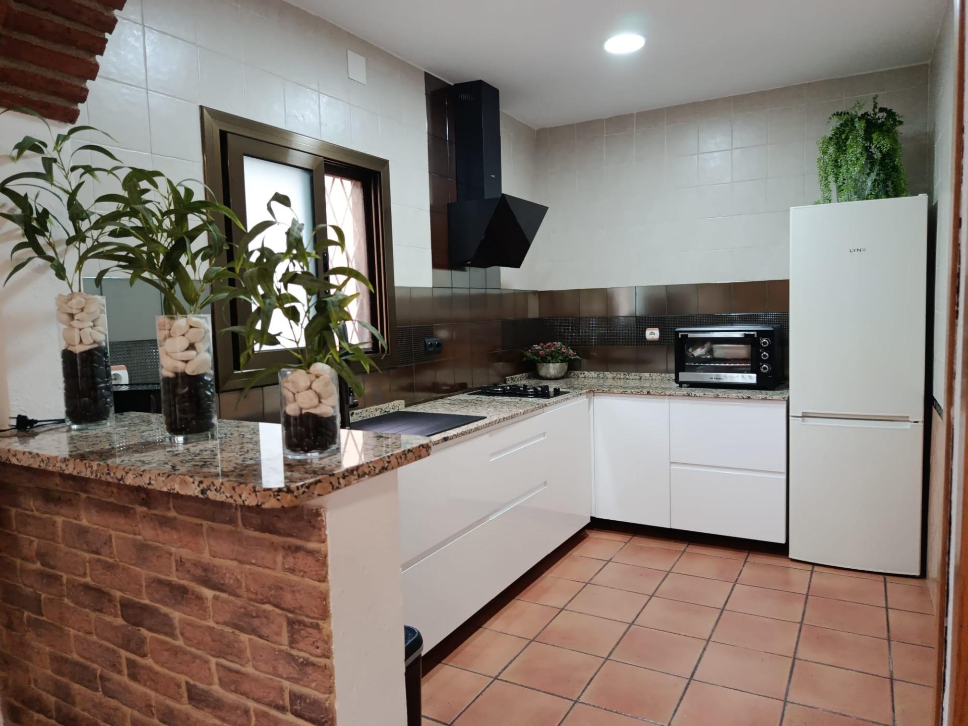 Cuisine semi‑ouverte entièrement équipée avec sortie directe sur le jardin et sur la zone barbecue