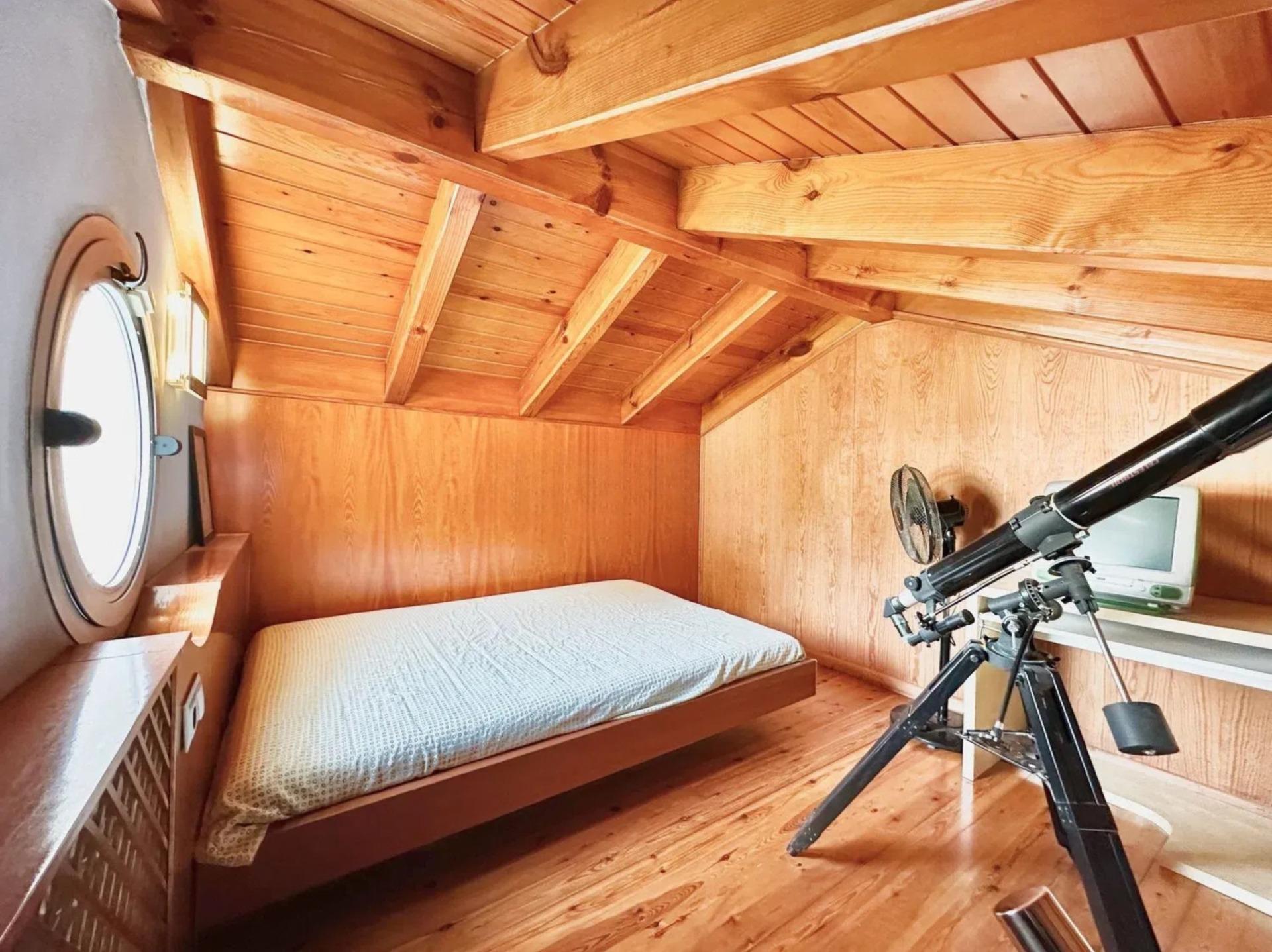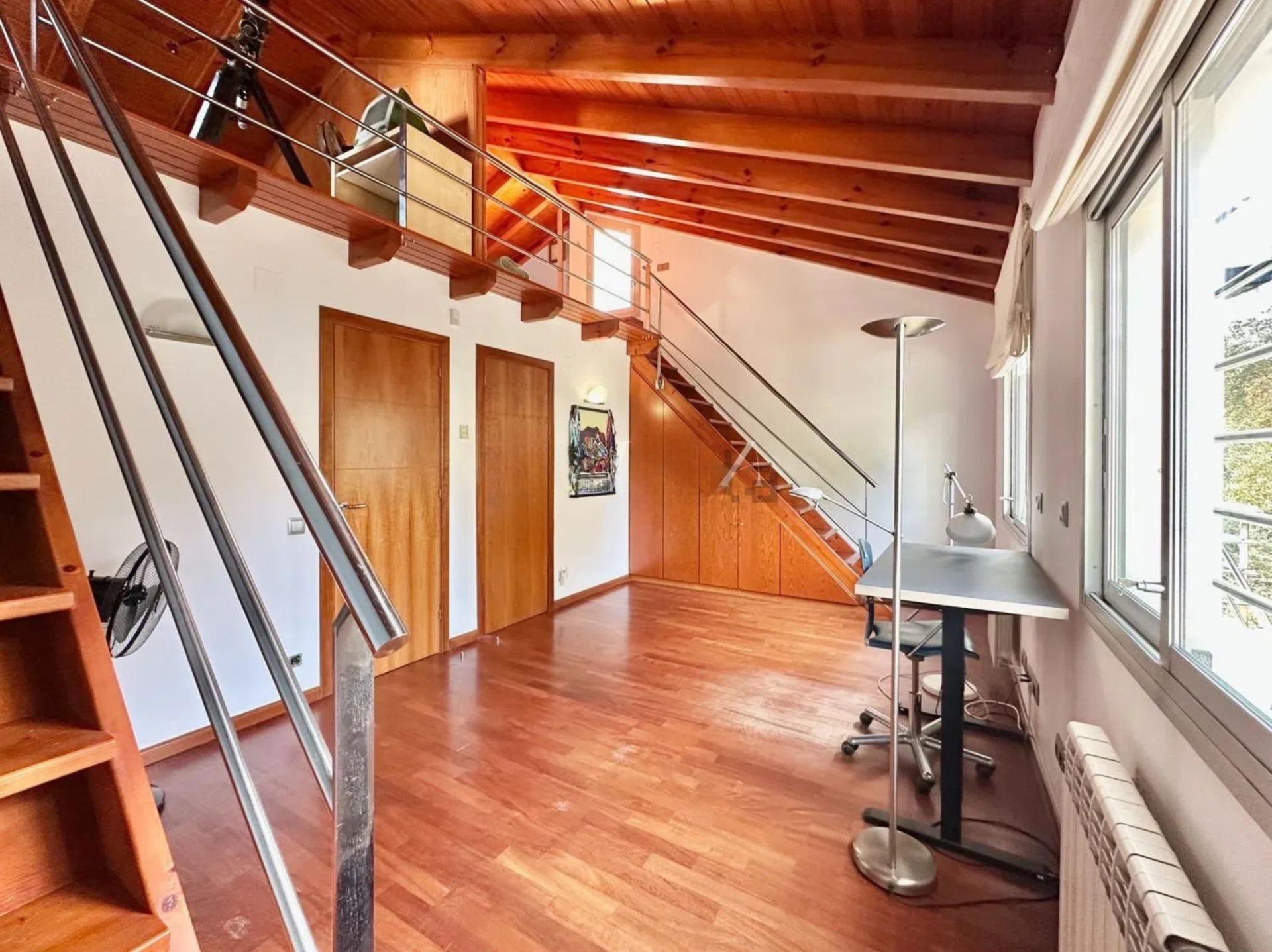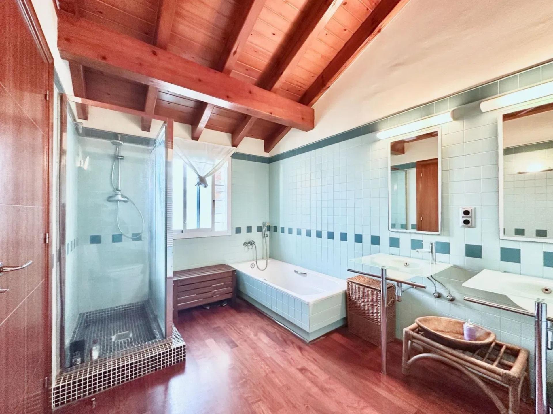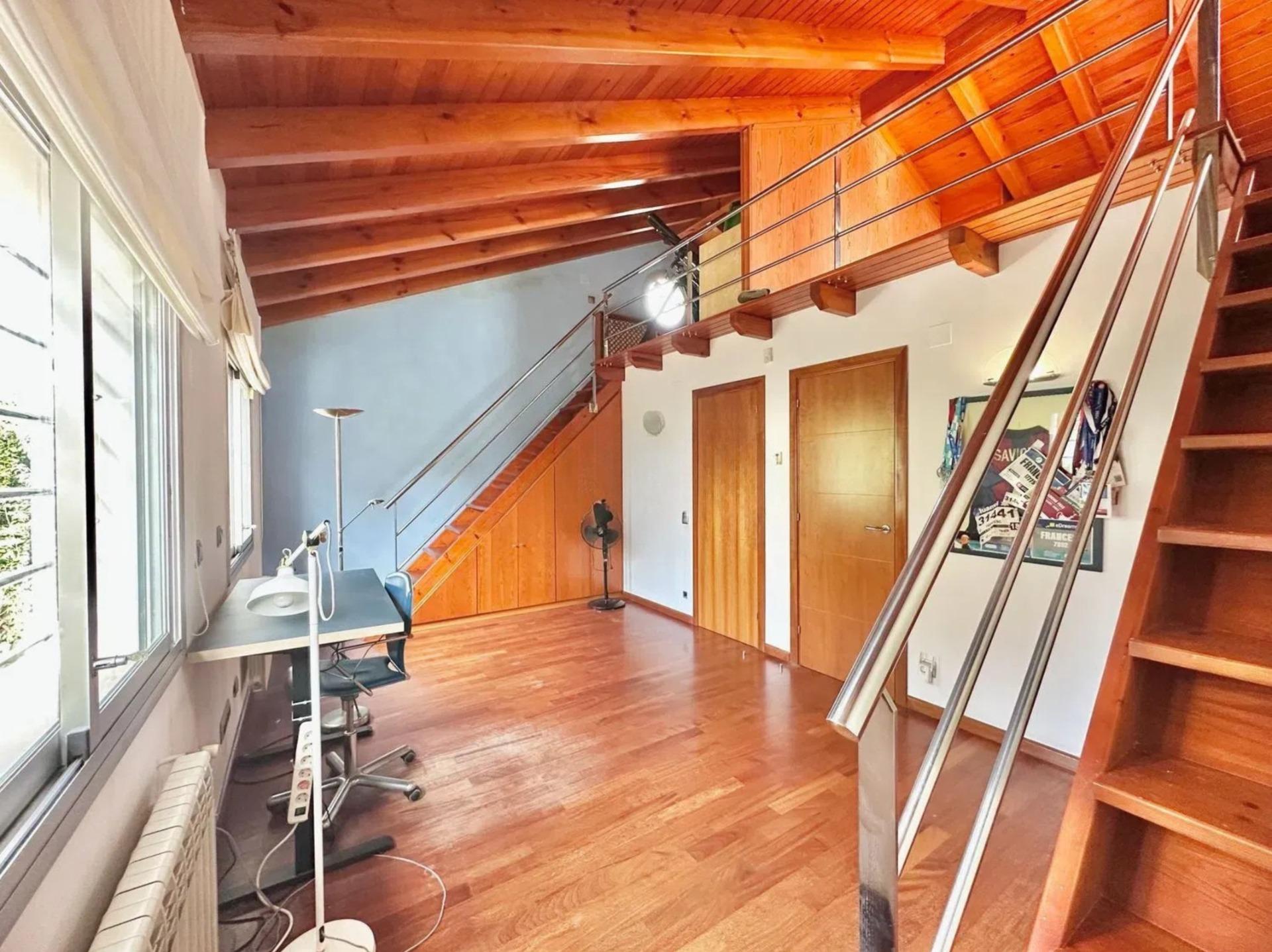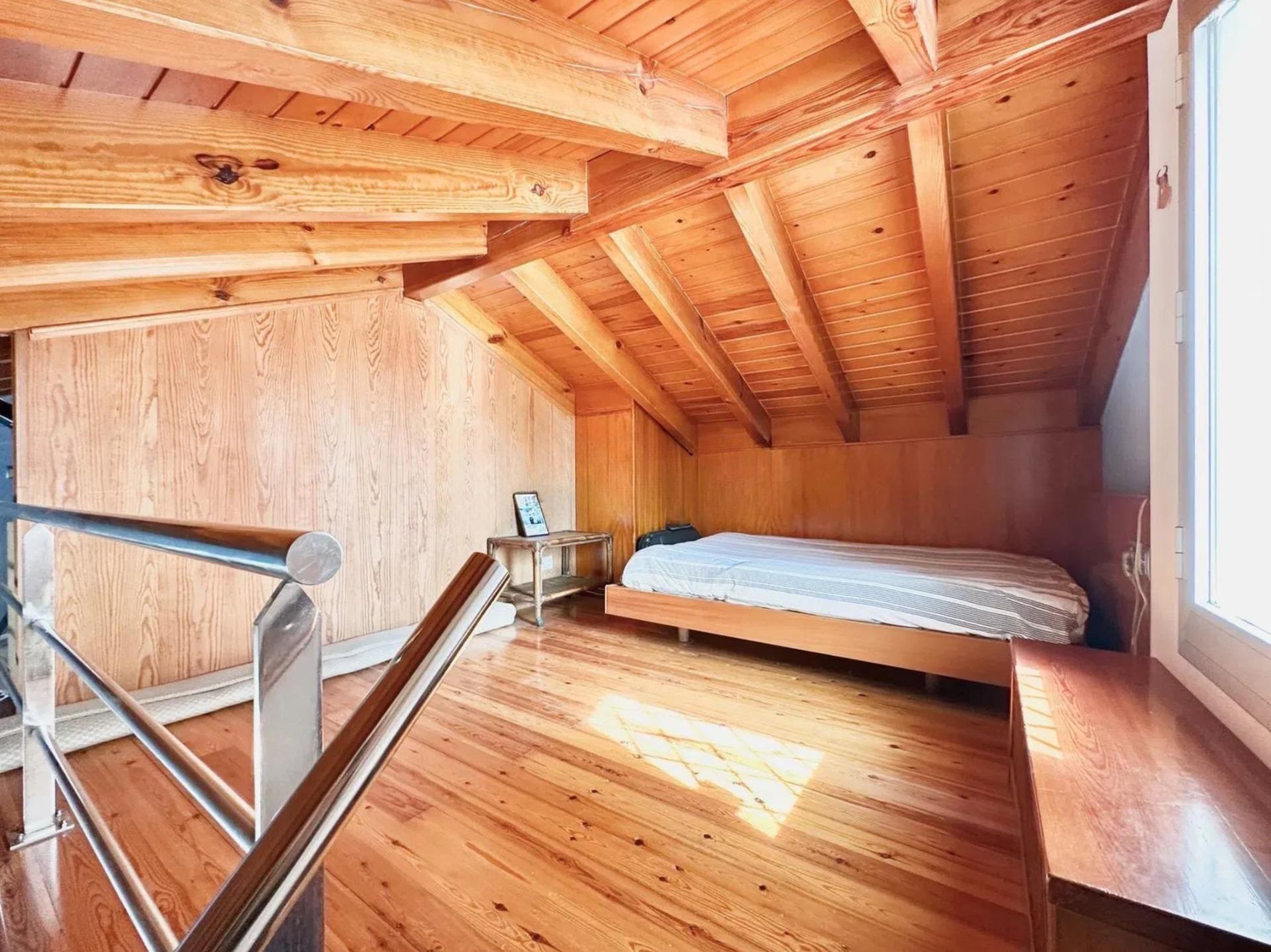L’un des éléments les plus singuliers de la propriété est son spectaculaire plafond mansardé avec poutres apparentes en bois, qui apporte caractère, chaleur et une sensation d’espace très particulière, créant une ambiance unique difficile à trouver dans les habitations contemporaines.