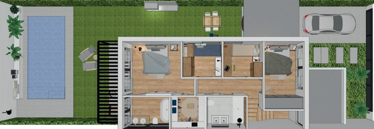 Maison à trois vents, 175 m2 construits sur un terrain de 250 m2 avec piscine privée, 5 chambres dont 1 au rez-de-chaussée et à l'étage deux doubles, dont une avec salle de bain en suite et deux simples, toutes eux extérieurs, une salle de bain complète au rez-de-chaussée et deux salles de bain complètes au premier étage, dont une en suite,