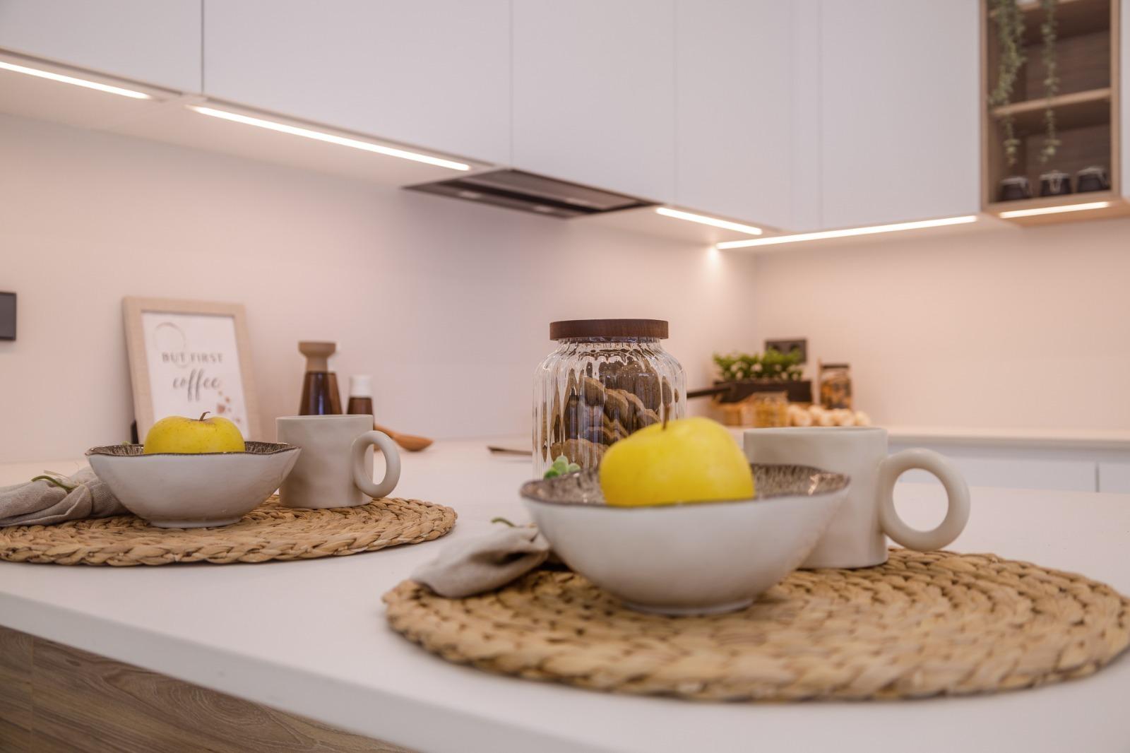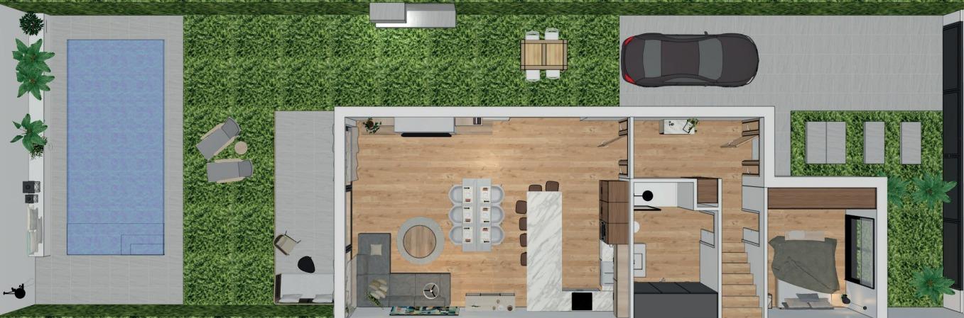 Cuisine ouverte (avec électroménager Bosch ou similaire, micro-ondes, four, lave-vaisselle, hotte et évier sous plan, mitigeur, plaque induction) sur un séjour de 45 m2 avec accès au porche et à la piscine.