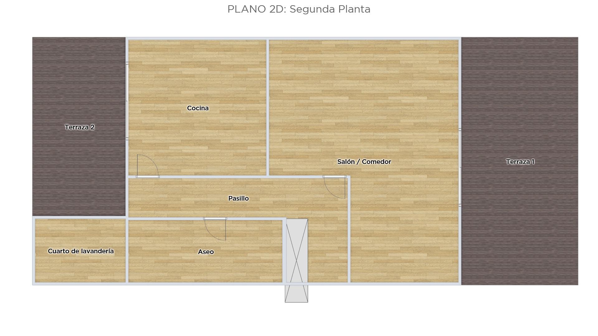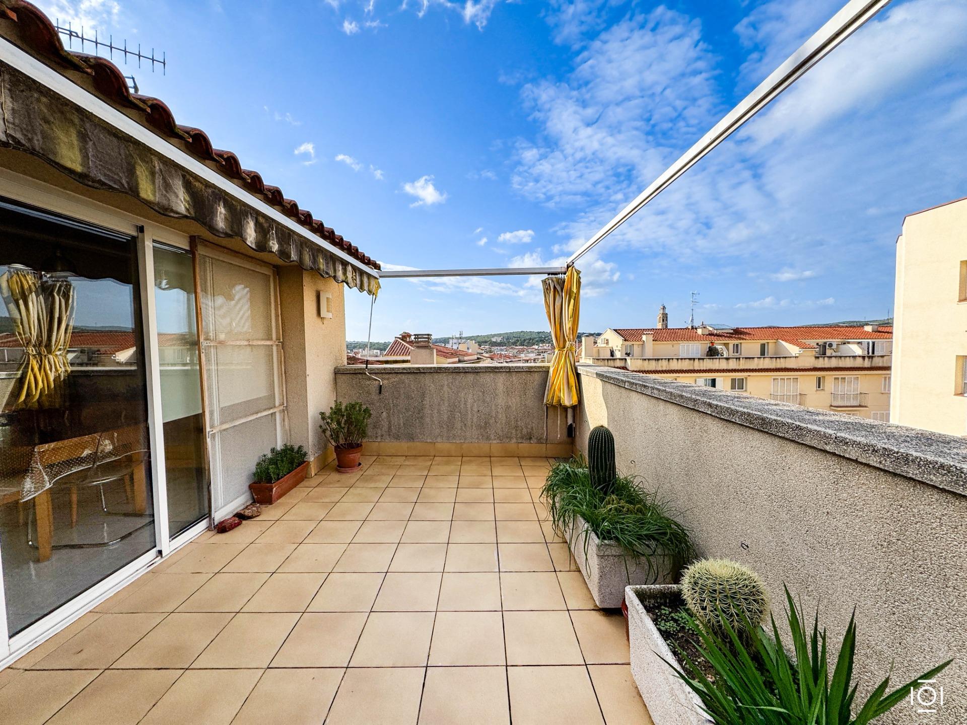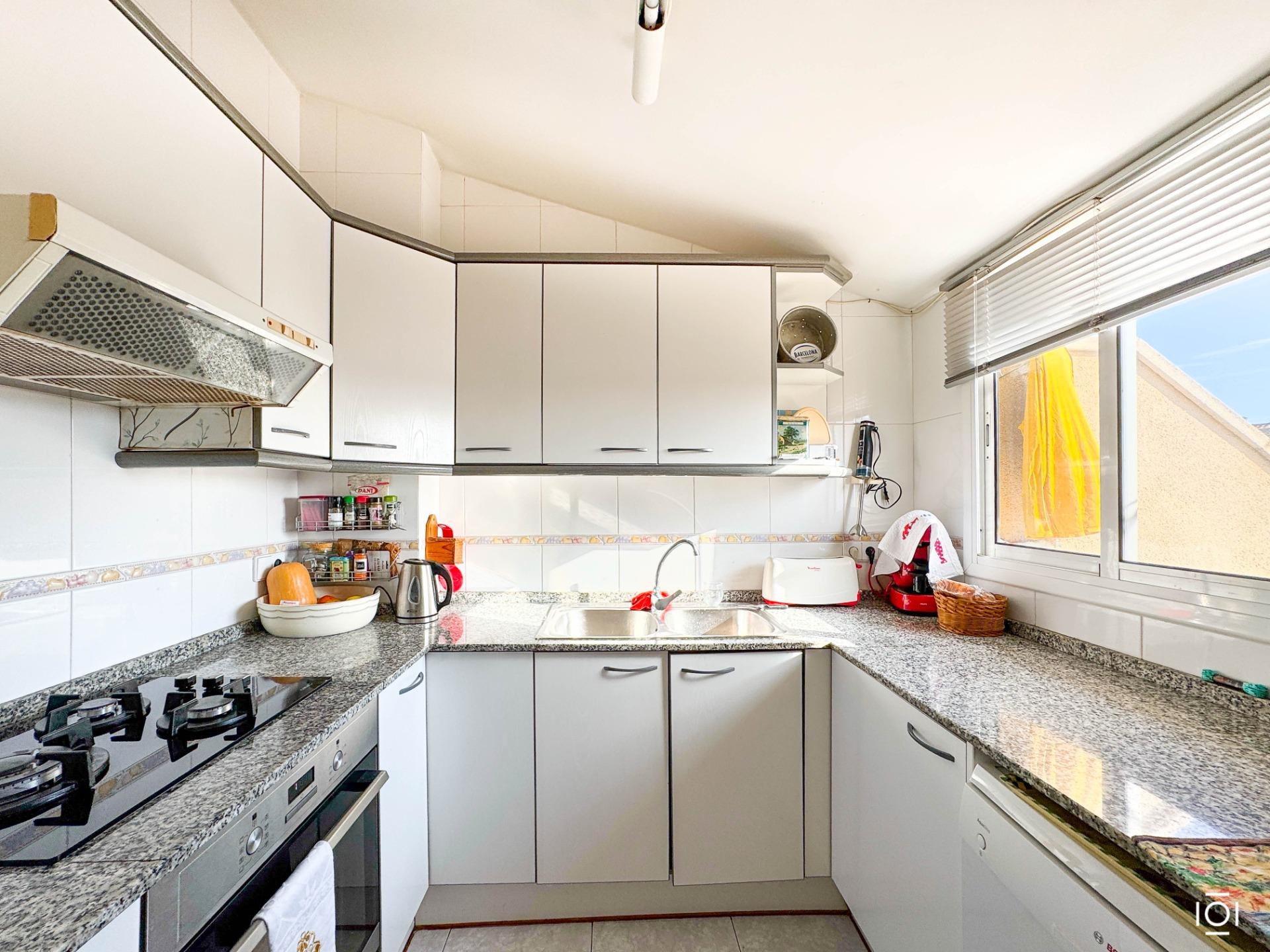 À l'étage supérieur, accessible par un escalier intérieur, se trouve l'espace de vie : une cuisine entièrement équipée avec plaque de cuisson au gaz, des toilettes invités et un séjour-salle à manger spacieux et lumineux donnant sur une grande terrasse offrant une vue agréable, idéale pour profiter du plein air. De l'autre côté se trouve une seconde terrasse avec un espace buanderie, exposée plein sud et bénéficiant d'un ensoleillement optimal tout au long de la journée.