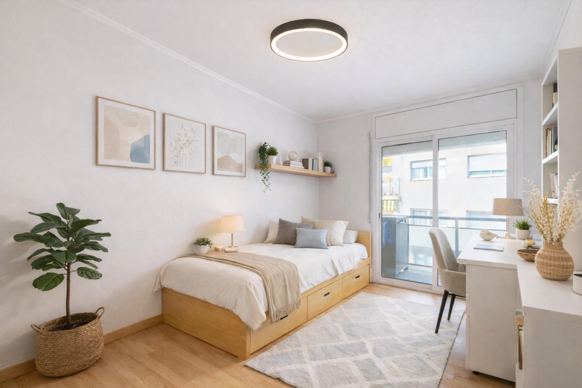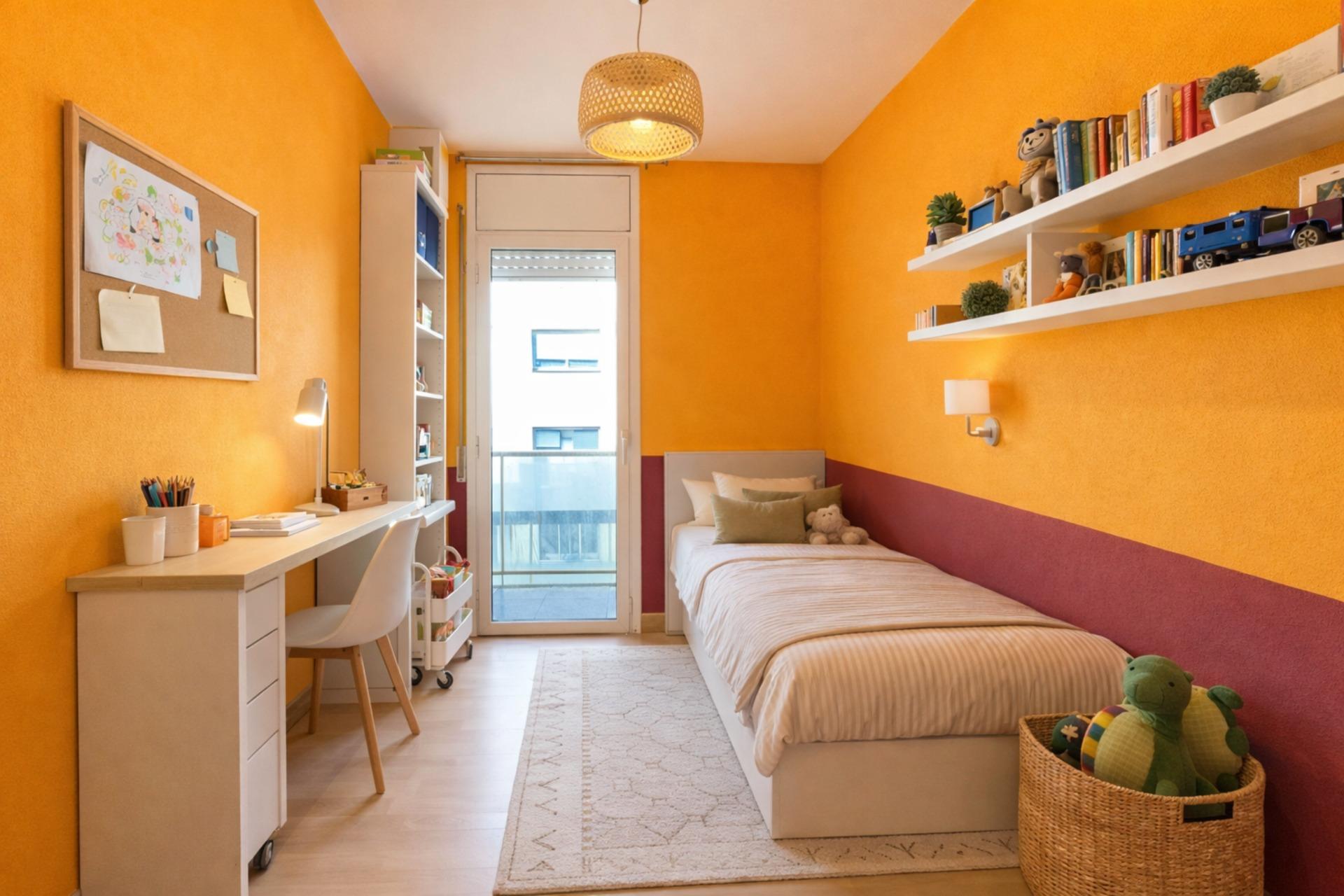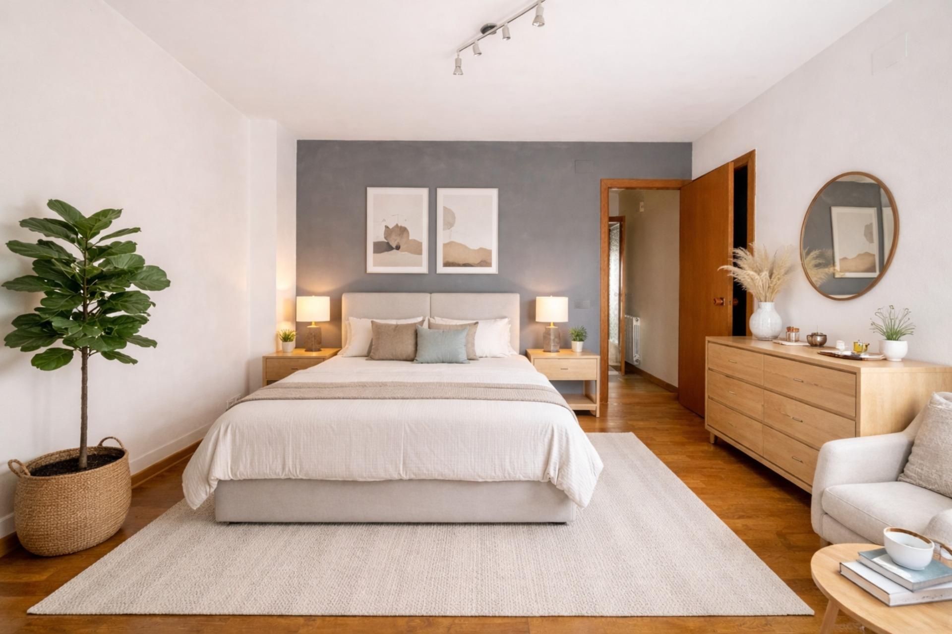 L'appartement comprend une chambre simple avec placard intégré et accès à un balcon, une chambre double également dotée d'un placard intégré et d'un accès à un balcon, et la suite parentale avec salle de bains privative, un dressing et un accès à un balcon. Toutes les chambres sont orientées vers l'extérieur, bénéficiant d'une abondante lumière naturelle et d'une excellente ventilation.
