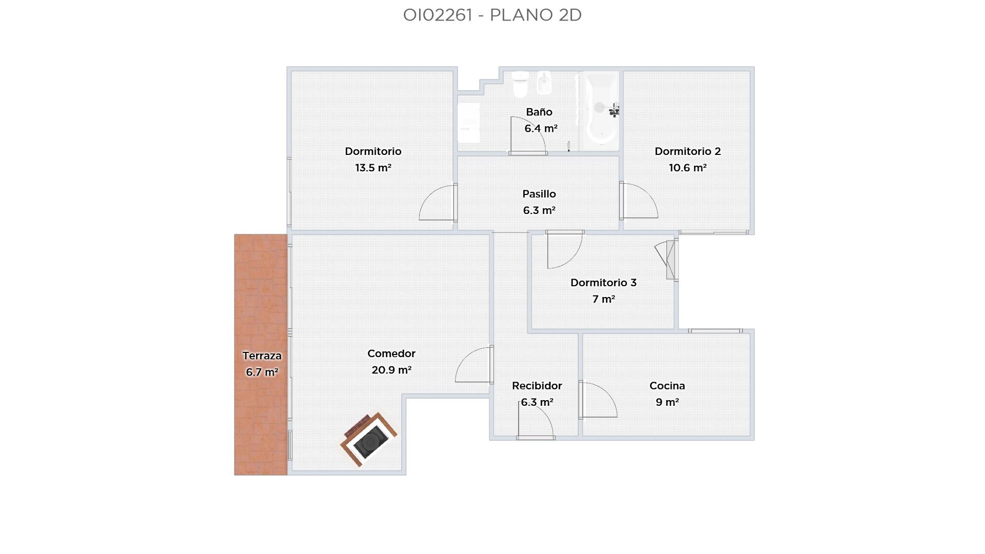 L'appartement comprend trois chambres, dont deux doubles, une cuisine entièrement équipée, une salle de bains avec baignoire et un spacieux séjour/salle à manger avec cheminée. Très lumineux grâce à son accès direct à une charmante terrasse exposée plein sud, il est idéal pour profiter du soleil et se détendre.
