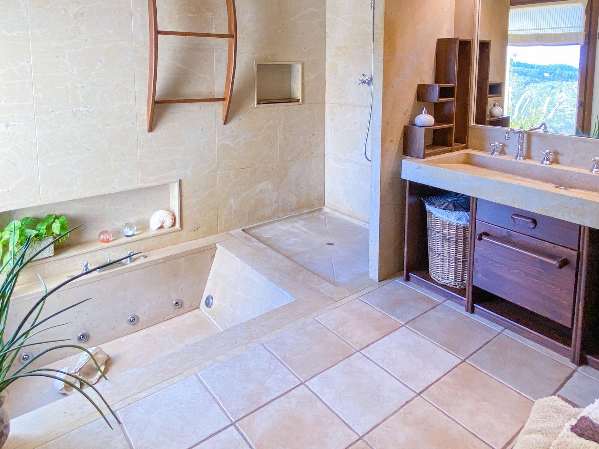 La cuisine entièrement équipée se présente comme un véritable centre d'activité, avec des appareils électroménagers de pointe et un espace idéal pour ceux qui aiment la gastronomie. La villa dispose de cinq chambres doubles généreuses, chacune conçue pour garantir confort et tranquillité. La suite principale se distingue comme une retraite privée, avec un grand dressing, une salle de bain luxueuse avec jacuzzi et une cheminée qui crée une atmosphère relaxante.