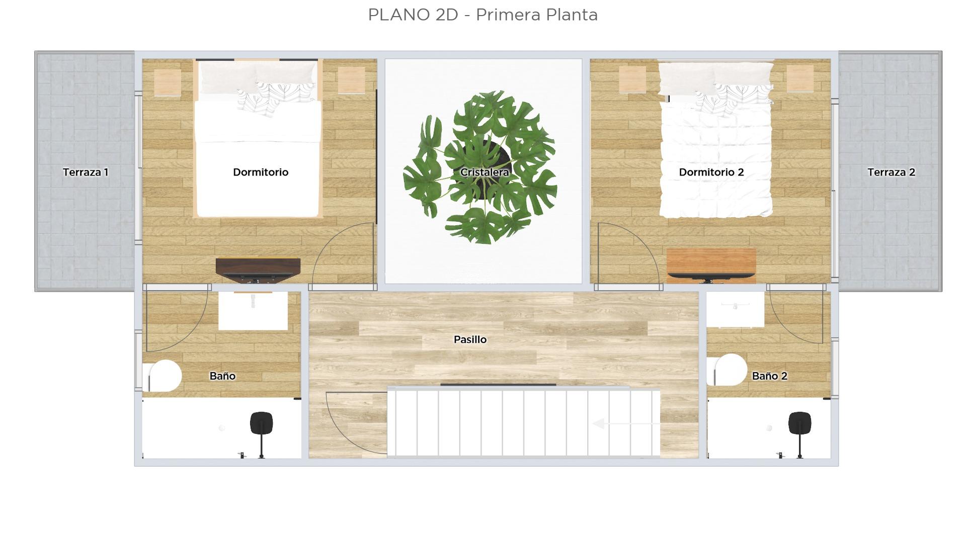 Premier étage : deux chambres avec salle de bains privative et un espace en double hauteur.