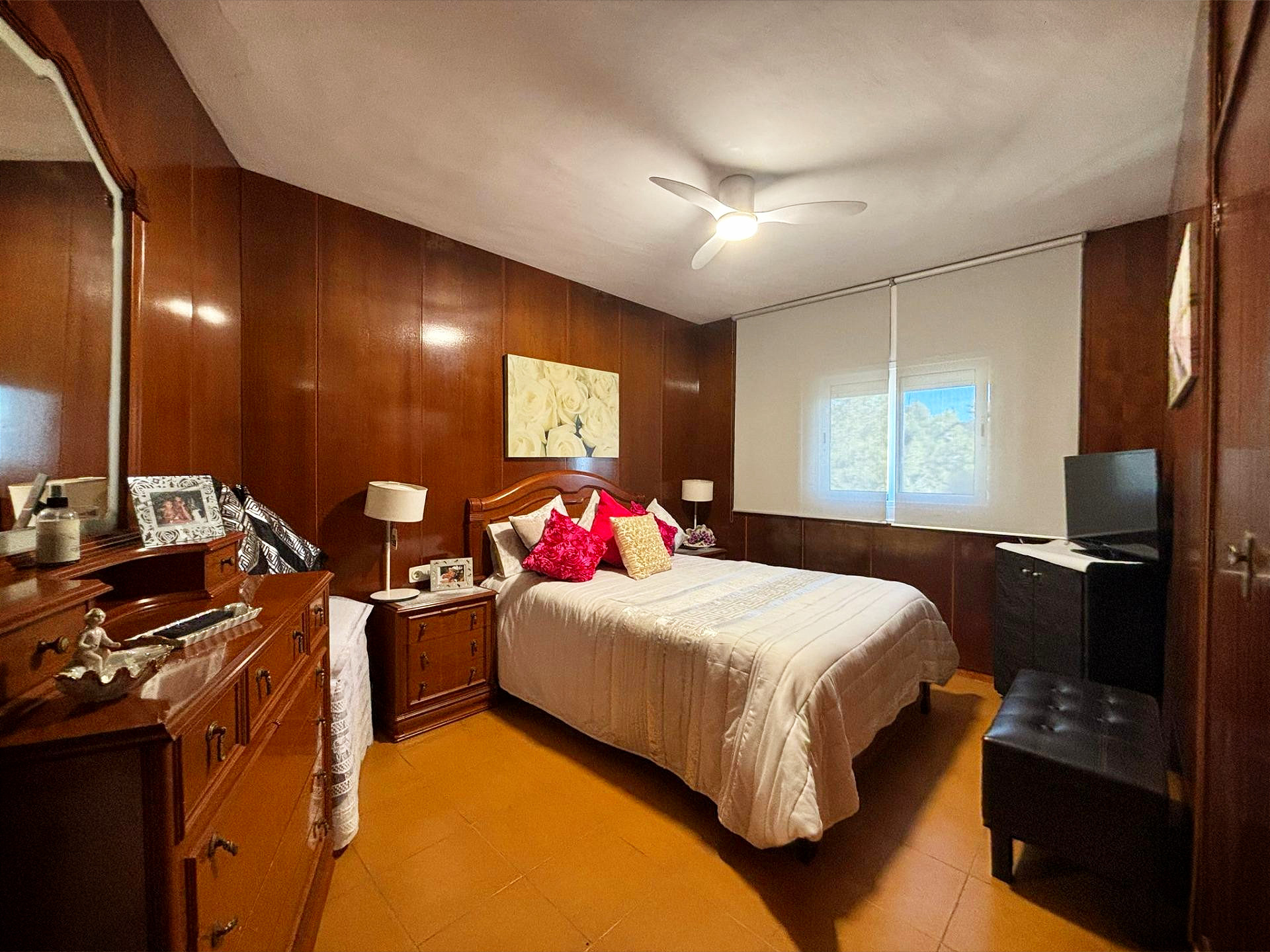 The first floor houses the sleeping area, consisting of three bedrooms (two doubles and one single) and a full bathroom with a bathtub.