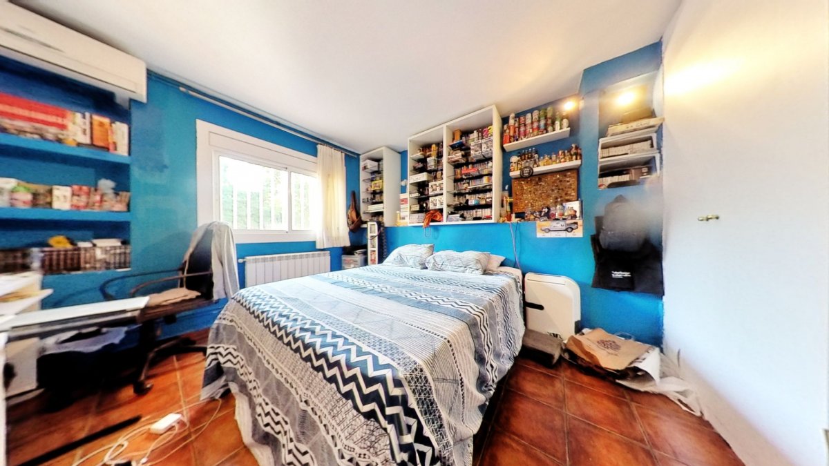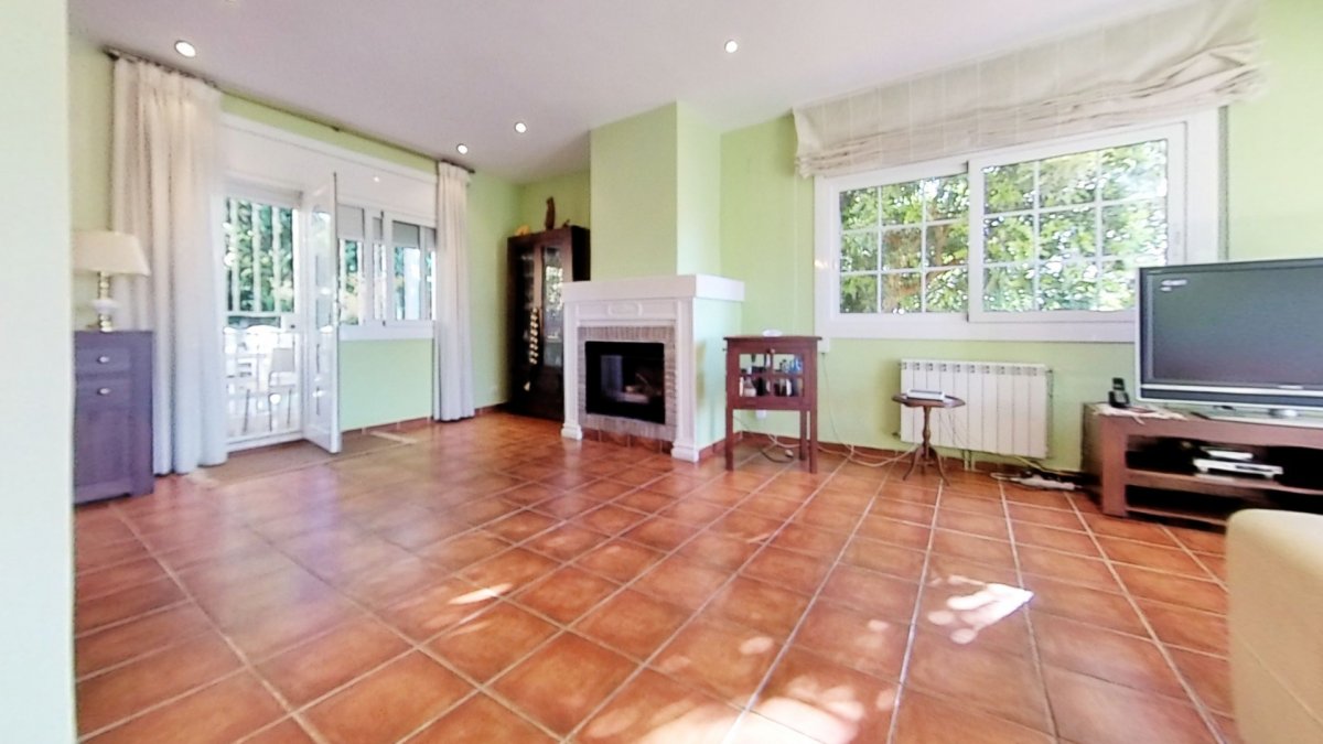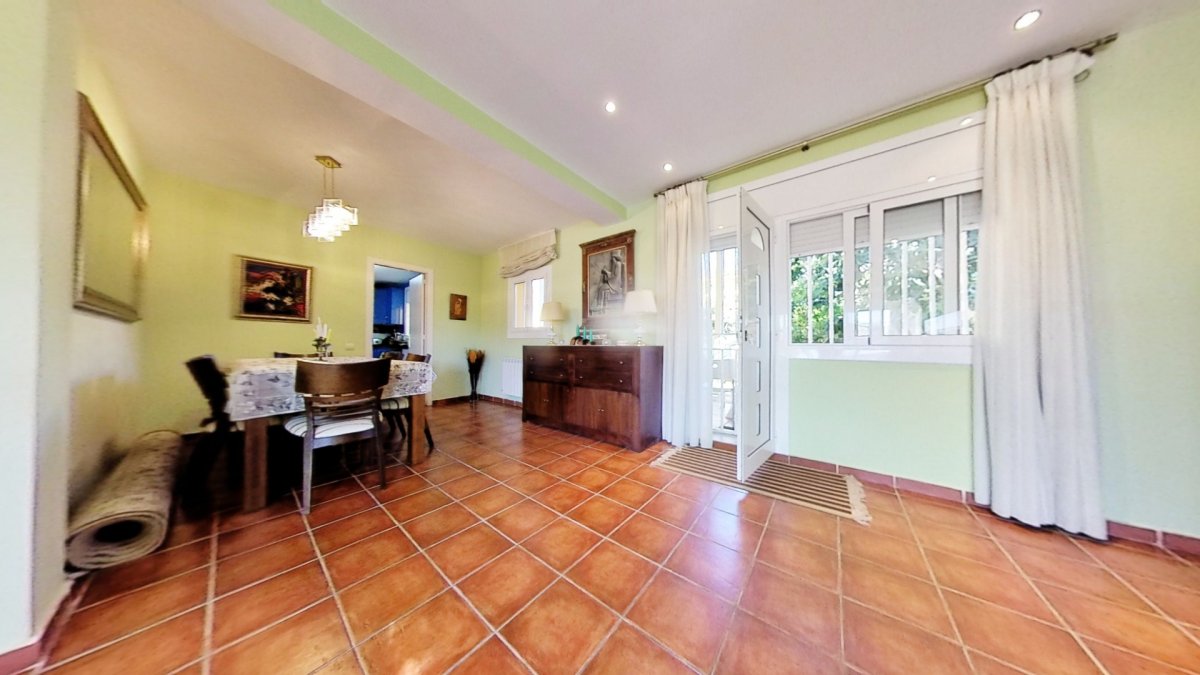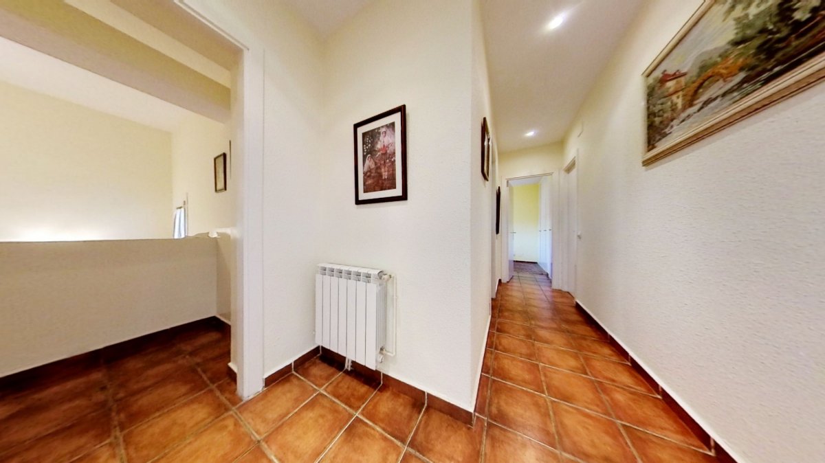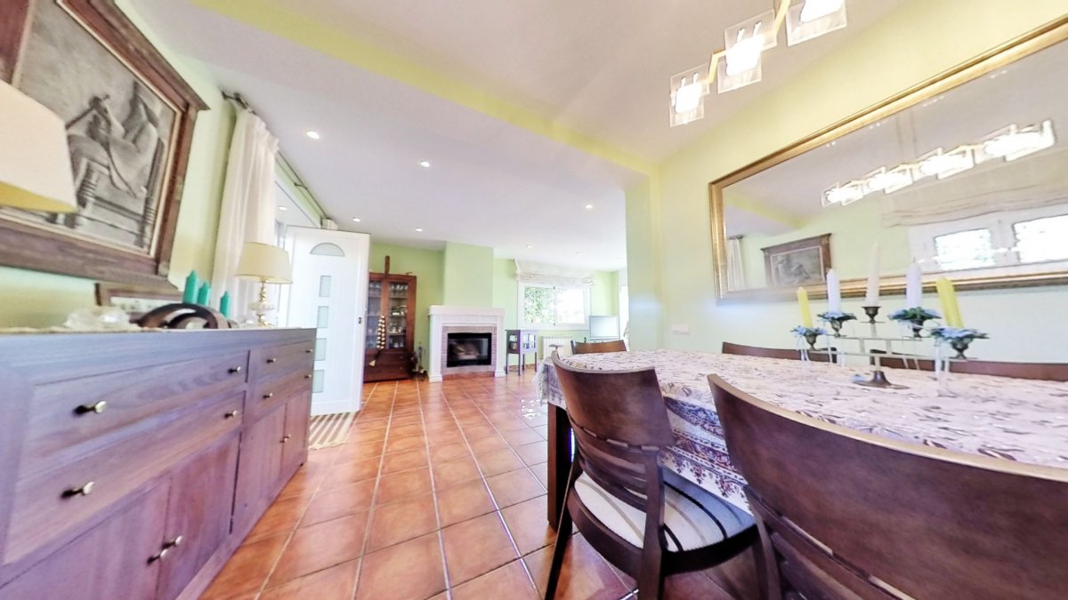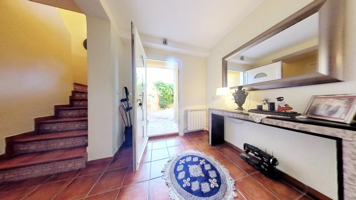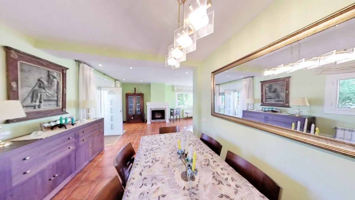 Upon entering, a large hall welcomes us, from where we access a distributor with a large built-in wardrobe. On this floor, we find two double bedrooms that share a full bathroom with a shower and bathtub. Going up to the upper floor, we are greeted by a 58 m² living-dining room with a fireplace, which opens onto a huge terrace with unobstructed views. The kitchen-diner is directly connected to the barbecue area and the garden with a pool.