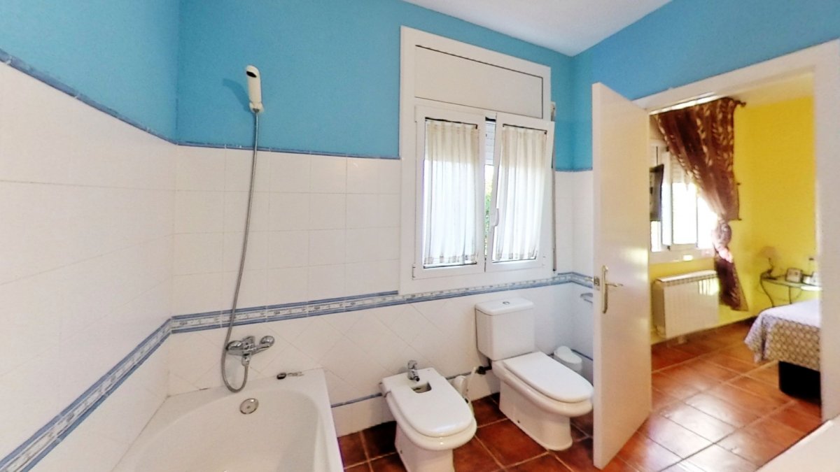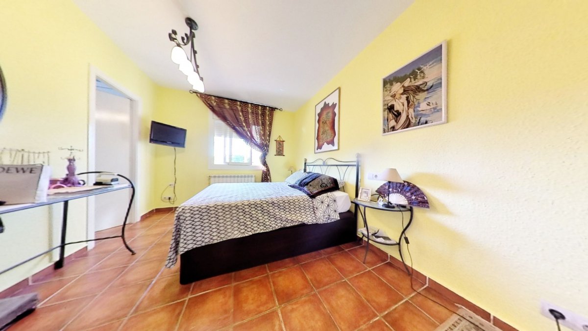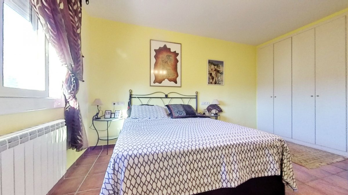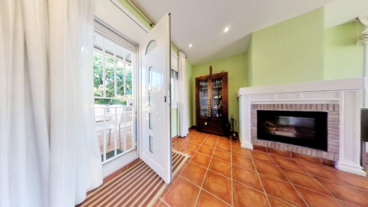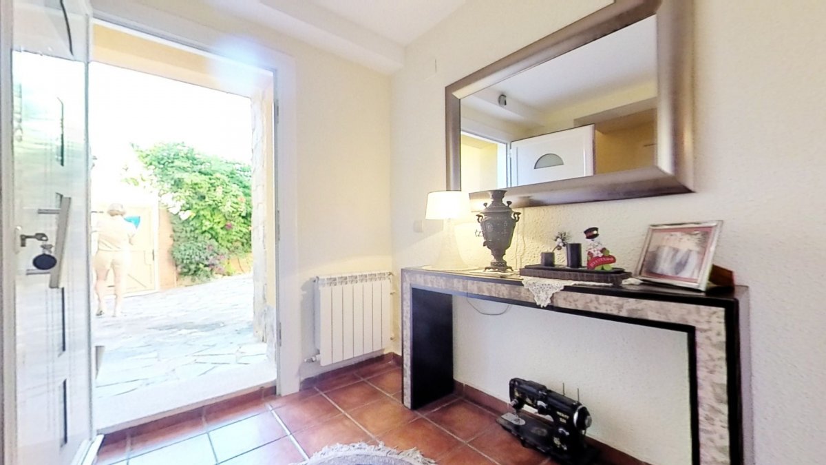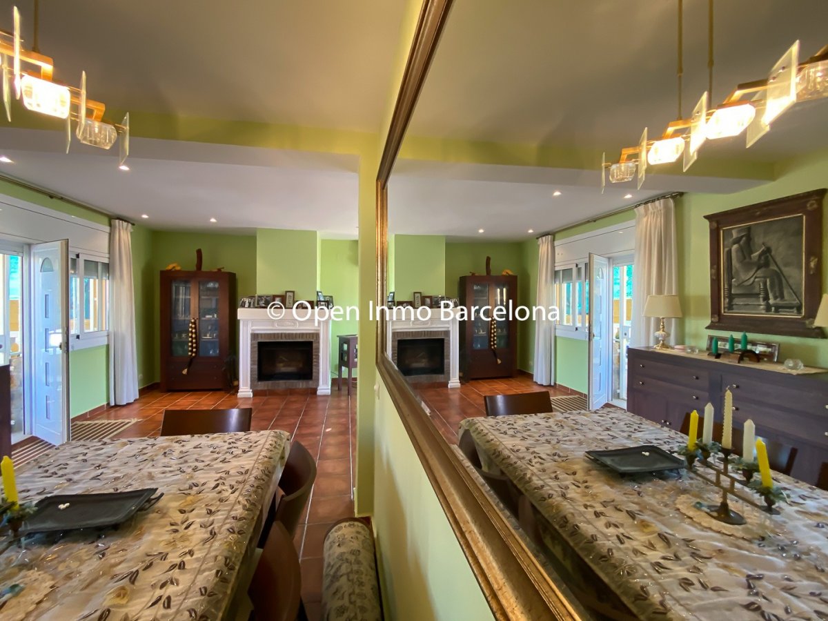 Upon entering, a large hall welcomes us, from where we access a distributor with a large built-in wardrobe. On this floor, we find two double bedrooms that share a full bathroom with a shower and bathtub. Going up to the upper floor, we are greeted by a 58 m² living-dining room with a fireplace, which opens onto a huge terrace with unobstructed views. The kitchen-diner is directly connected to the barbecue area and the garden with a pool.