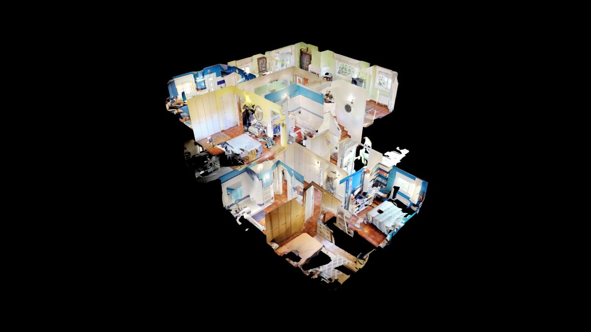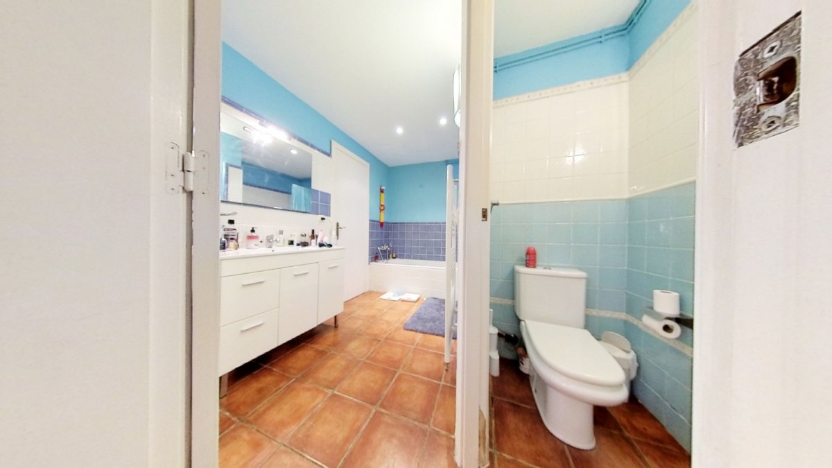 The master suite on this floor offers a private bathroom with a bathtub, and a guest toilet is available for guests. The house is equipped with fitted wardrobes, electric shutters and dimmable lights, ensuring comfort at all times.