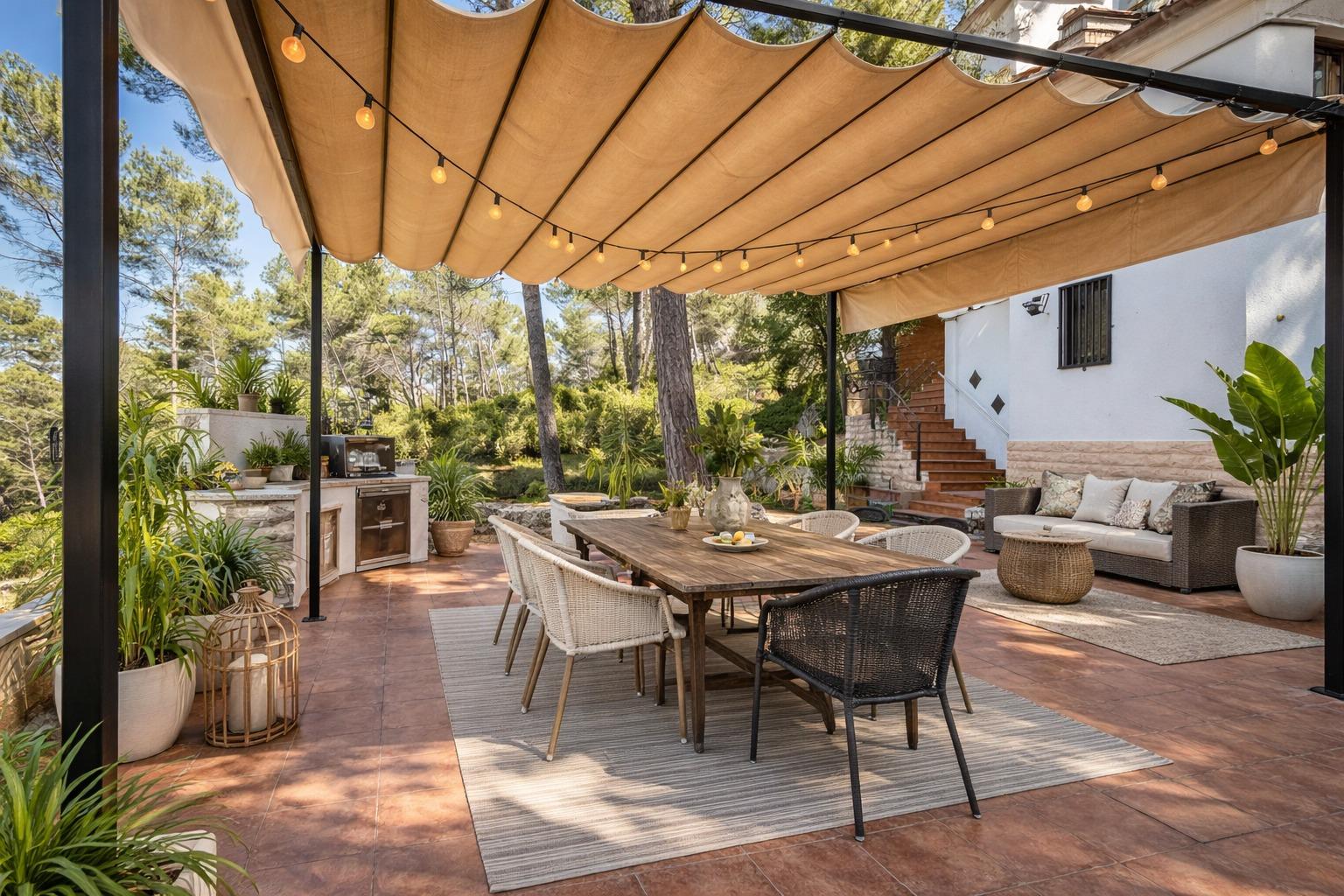The 755 m² plot surrounds the home with a well-kept and private natural setting. The outdoor garden combines green areas with native plants and functional spaces, including a large terrace with a pergola and barbecue area, ideal for al fresco dining, celebrations, or relaxing moments.