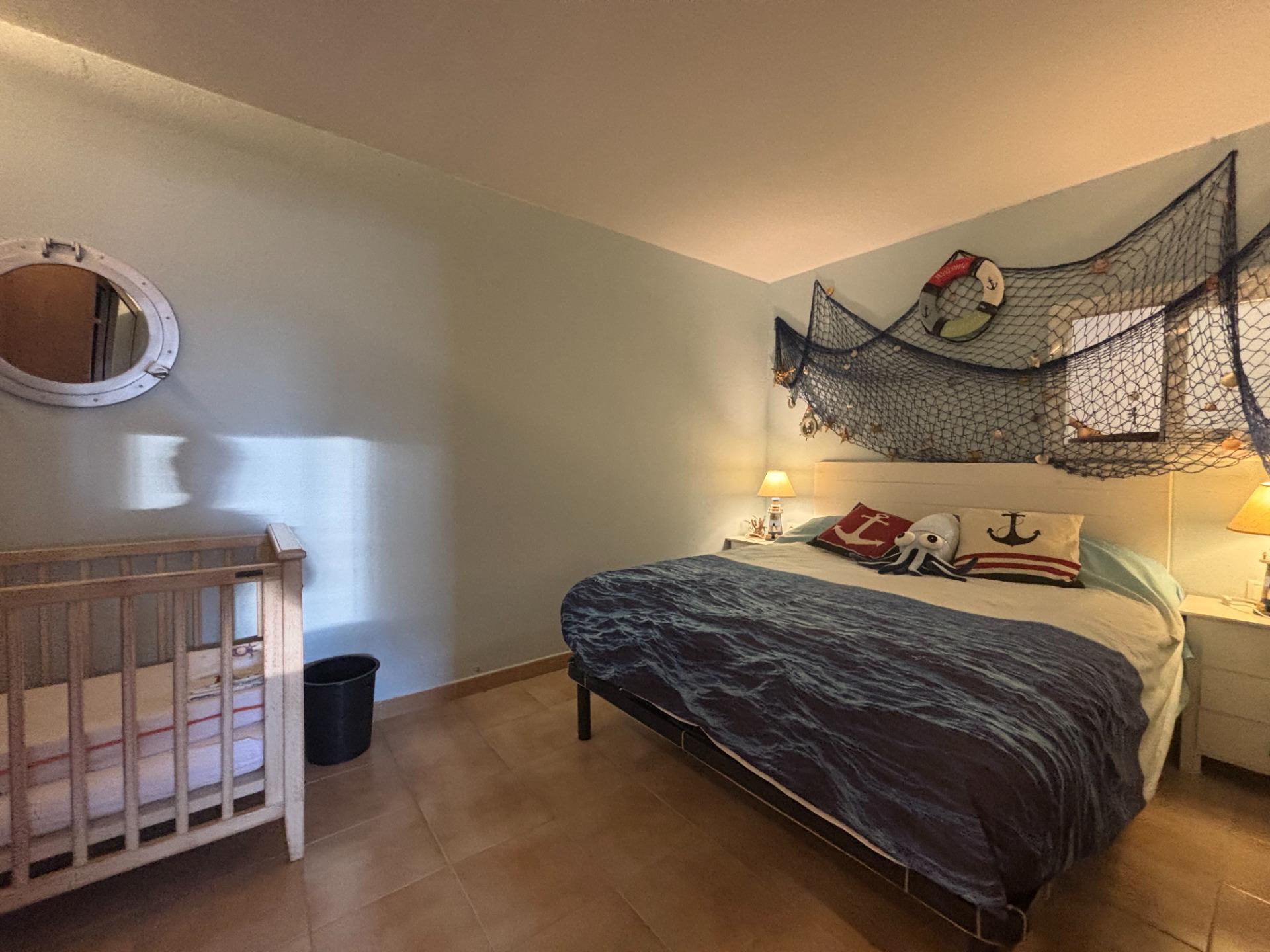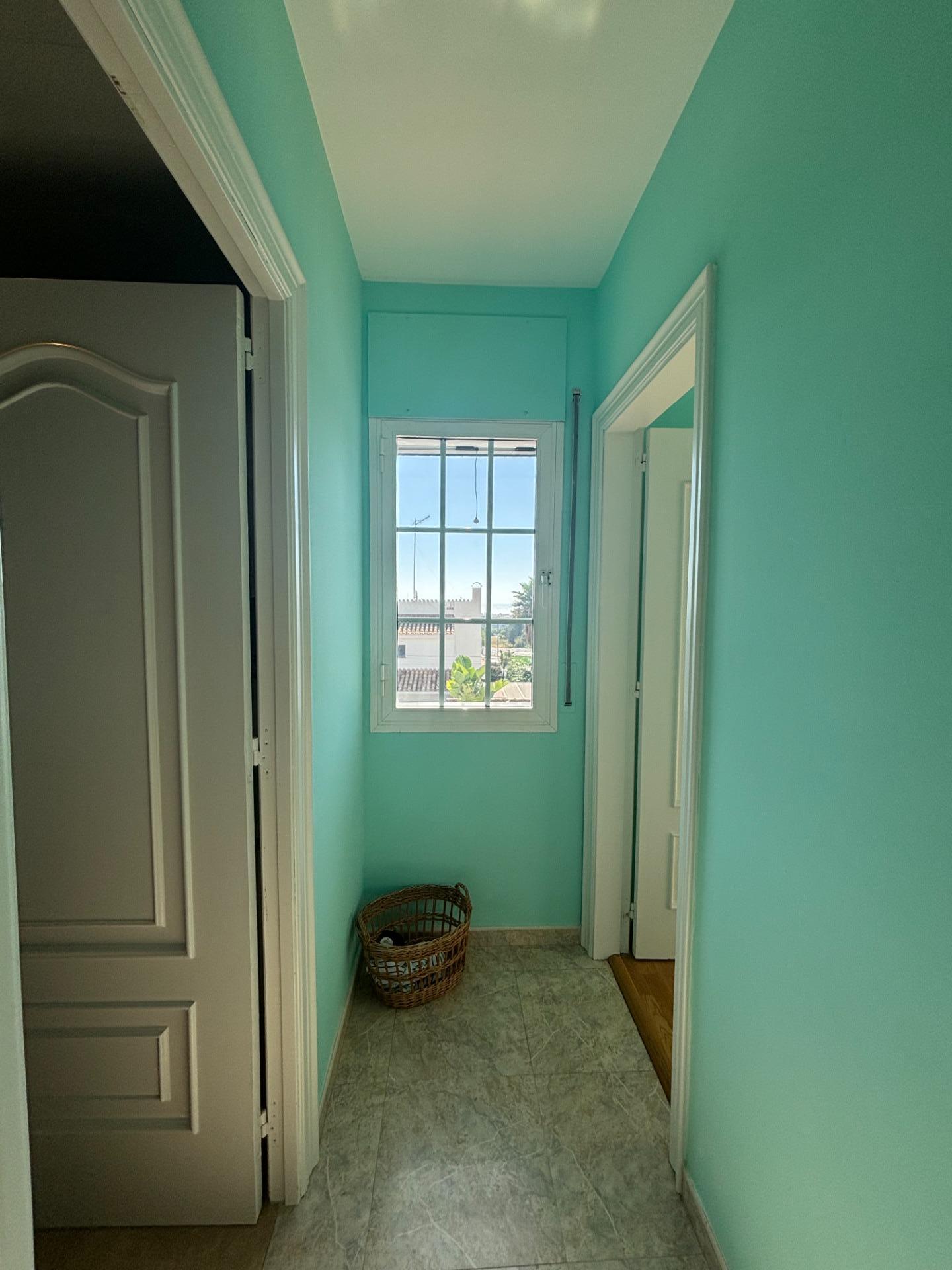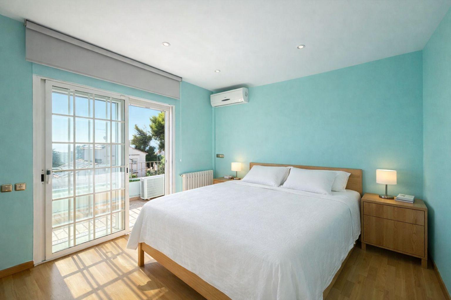 Upper floor: two double bedrooms. The master suite has a private bathroom and access to a terrace with lovely sea views. A second full bathroom serves the other bedroom.