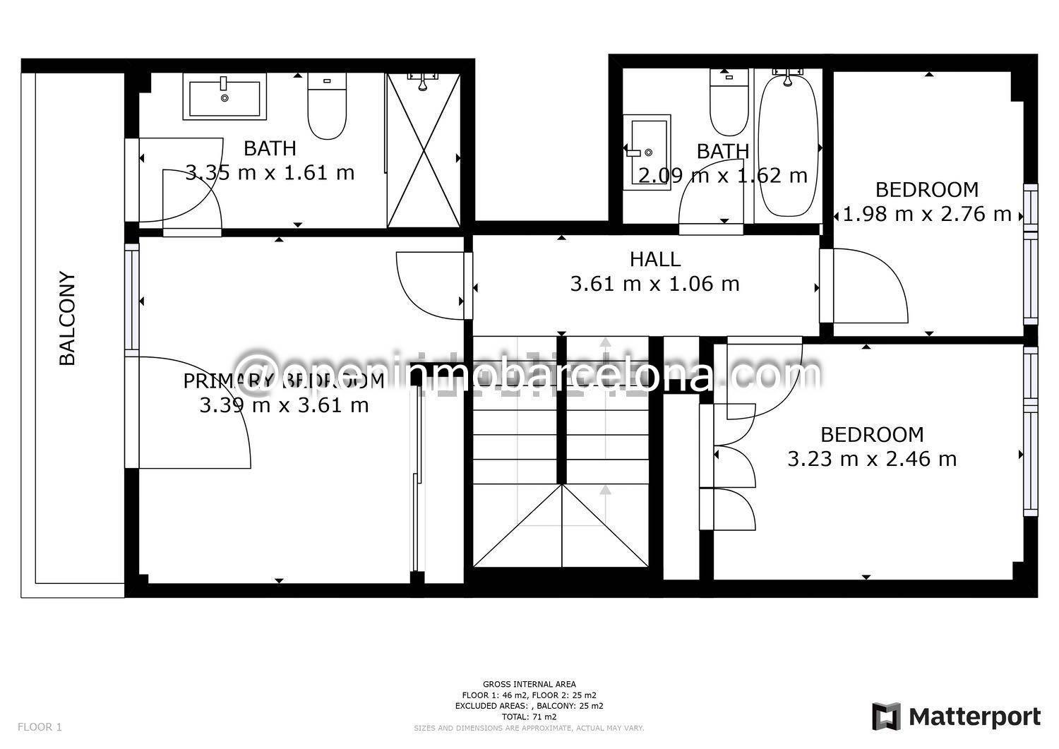 On the first floor, we have the night area: 2 double rooms, one of them en suite with bathroom and private terrace, 1 single room and a complete bathroom with shower.