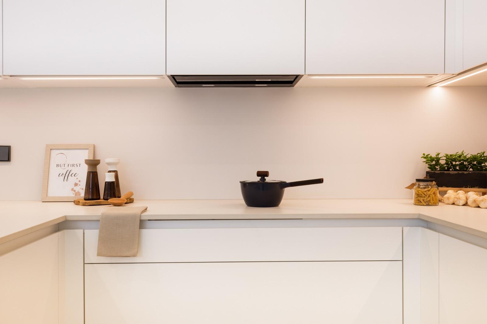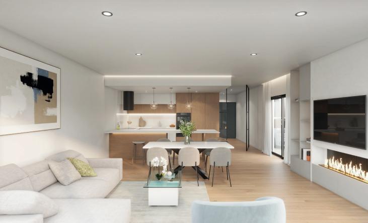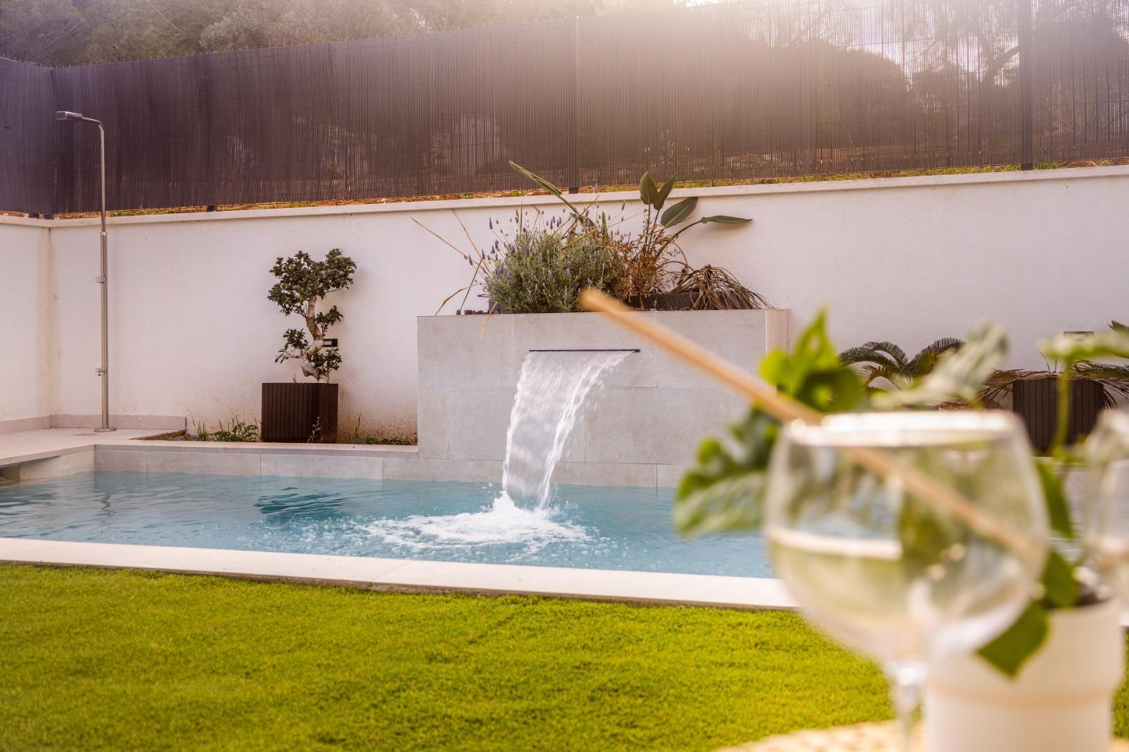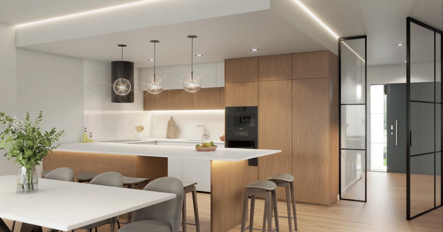 Open kitchen (with Bosch or similar appliances, microwave, oven, dishwasher, hood and under-counter sink, single-control taps, induction hob) to a 45 m2 living room with access to the porch and pool.