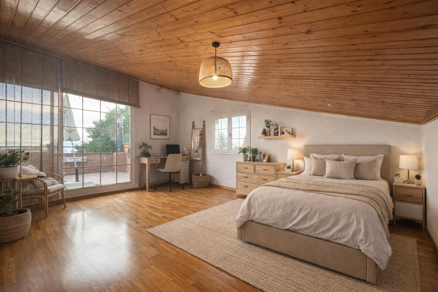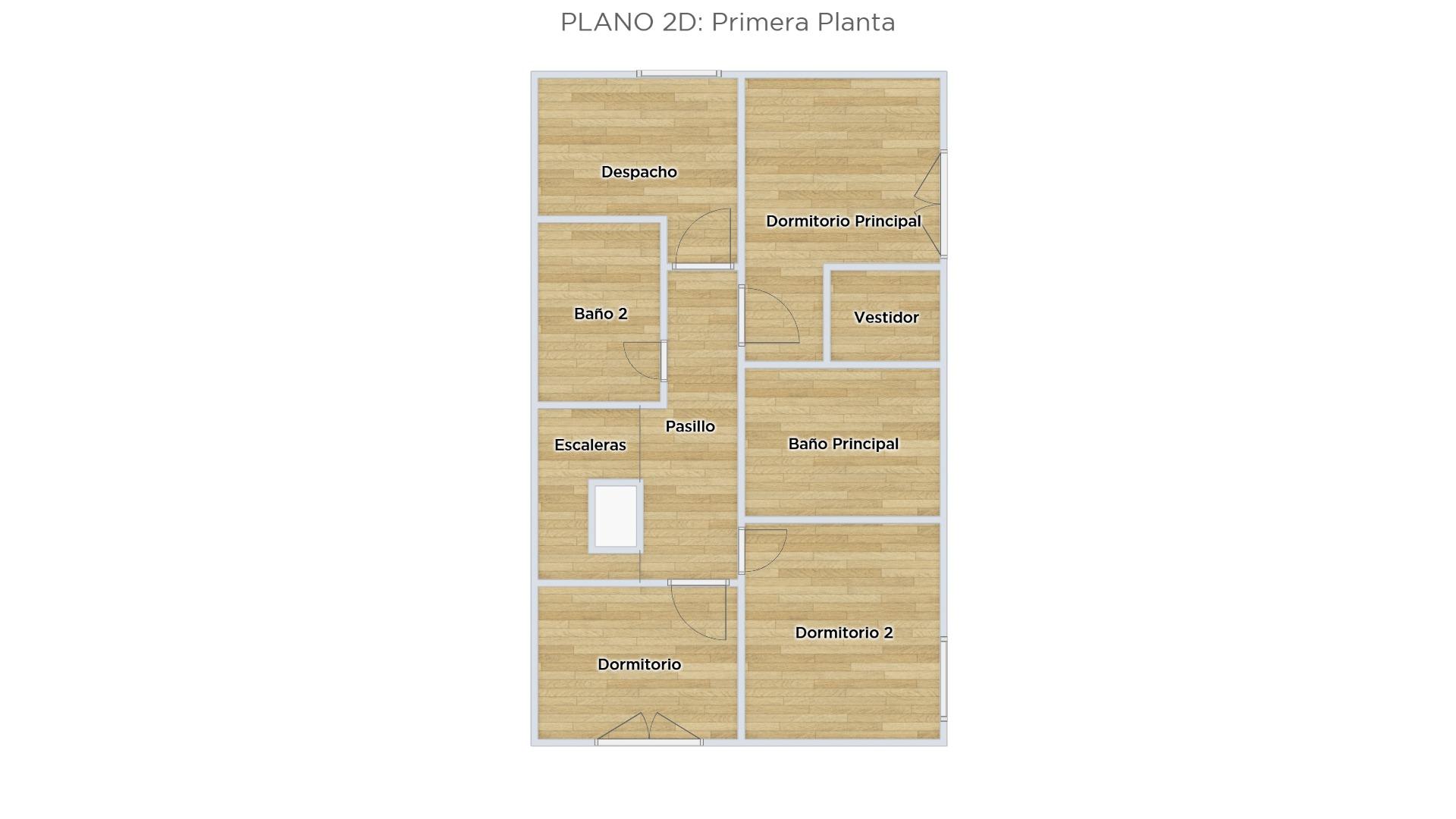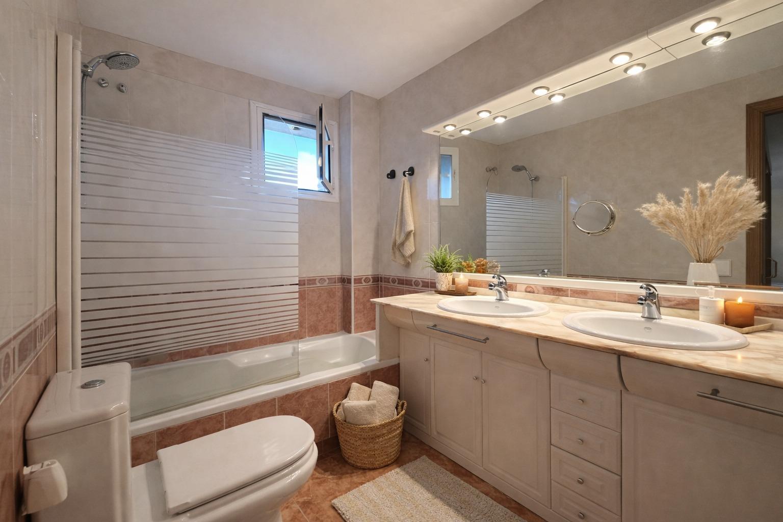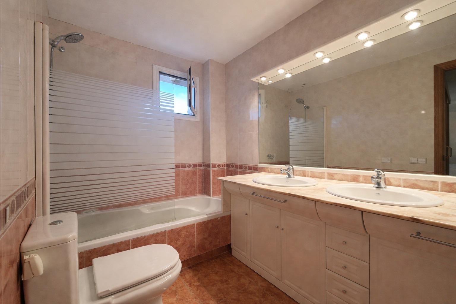 The first floor is dedicated to the sleeping area, with three double bedrooms and a full bathroom. The master suite stands out for its walk-in closet and private bathroom equipped with a double sink and bathtub, offering an intimate and comfortable space.