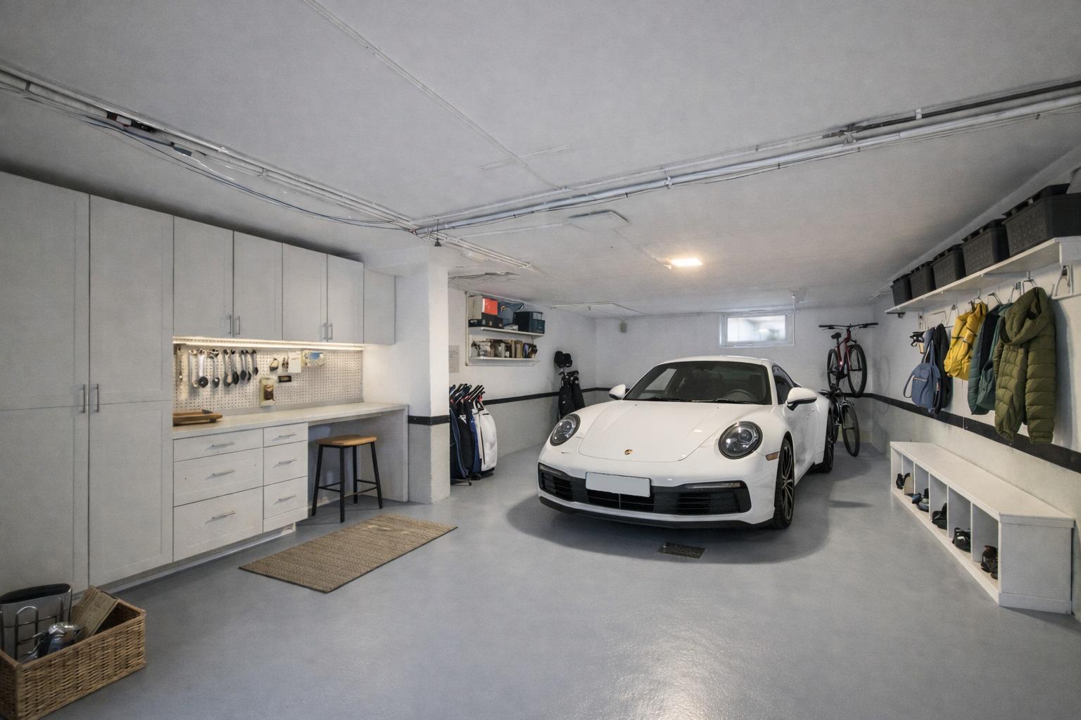 In the semi-basement, there is a large garage with space for several vehicles, as well as a convenient storage area.