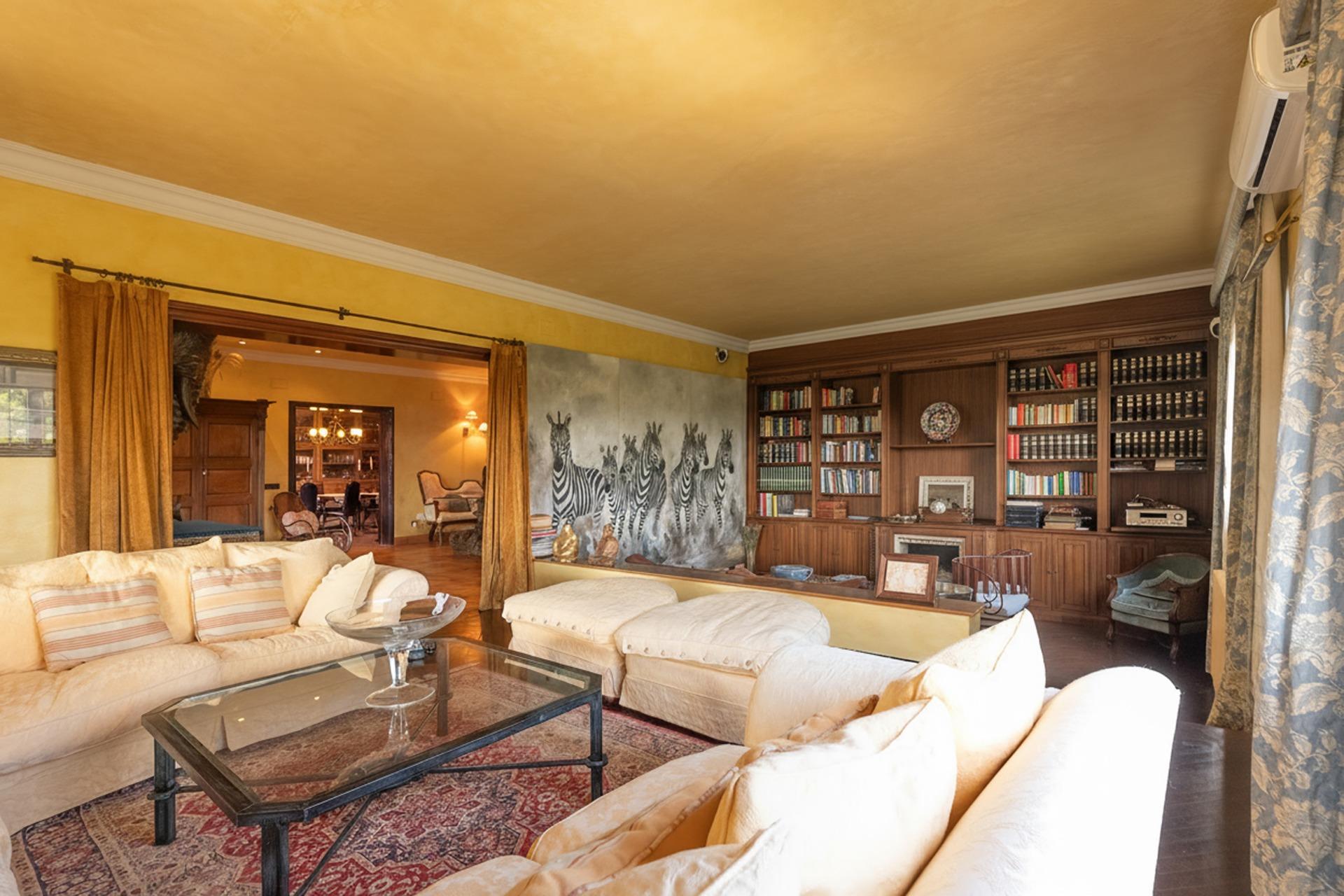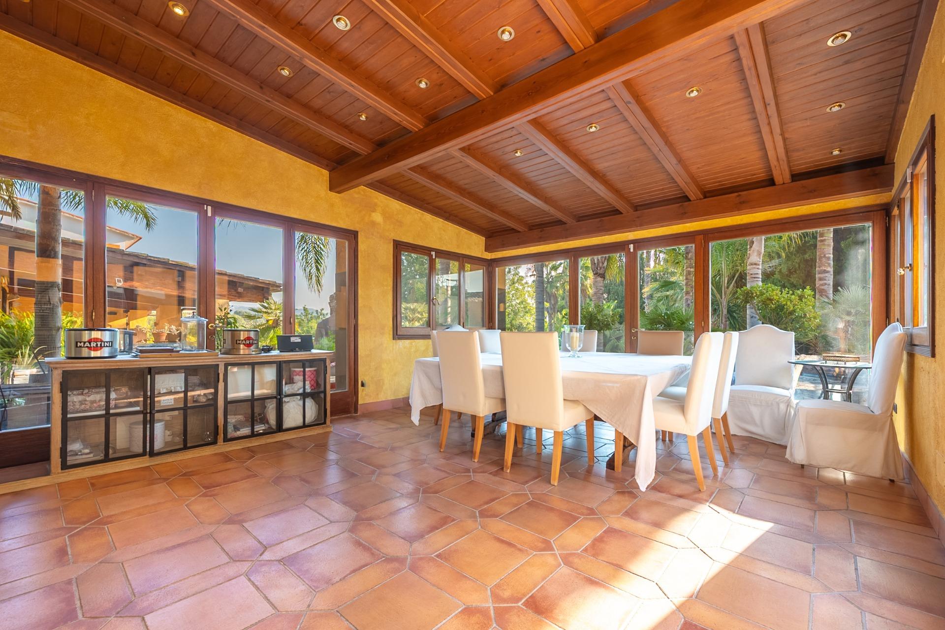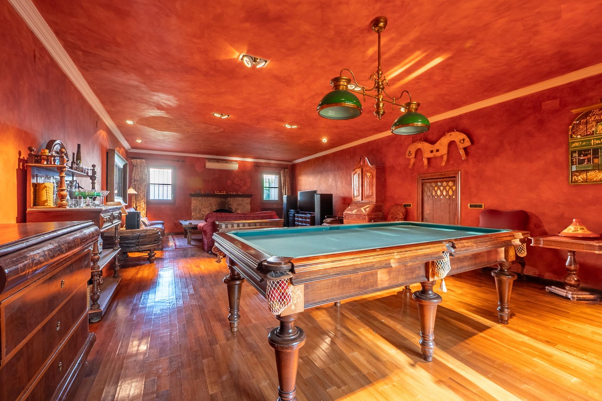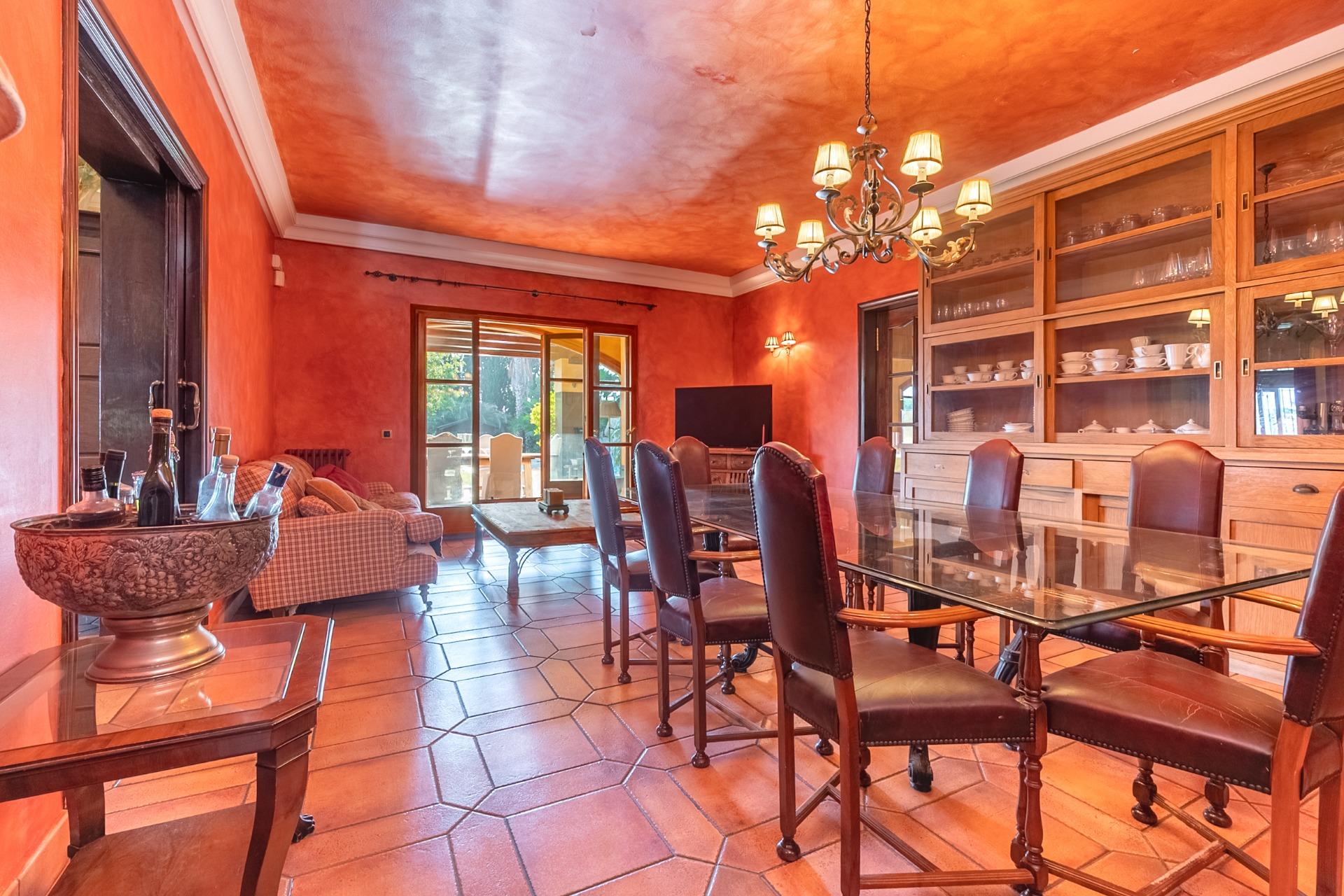 En la planta principal, un amplio hall da la bienvenida y conecta con un gran salón biblioteca, un comedor de 100 m² y una espaciosa cocina de 100 m². En esta misma planta se encuentra un segundo salón con chimenea y billar, así como un fantástico porche con zonas de comedor, estar y chill-out. Además, dispone de un comedor de verano acristalado con vistas al jardín.