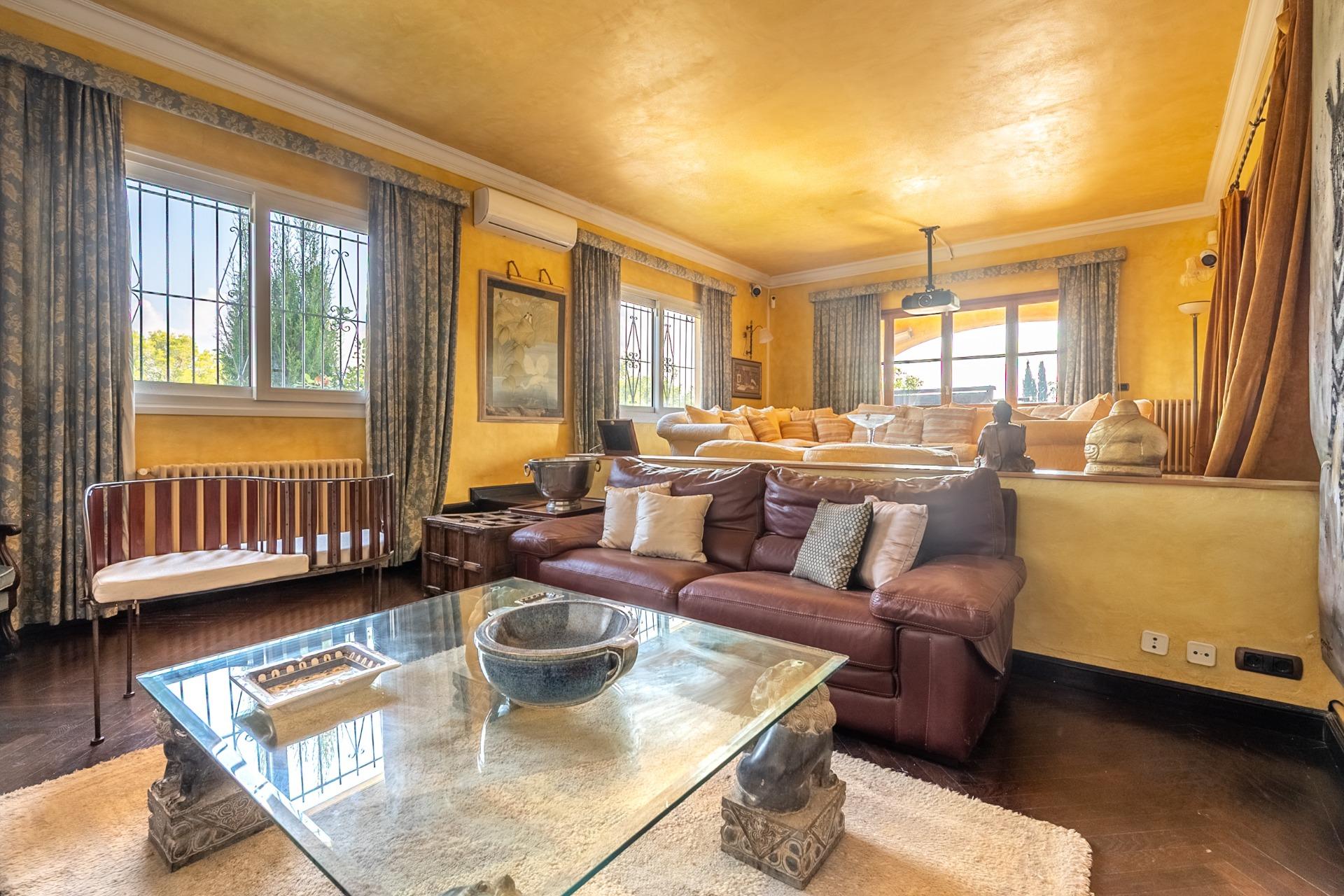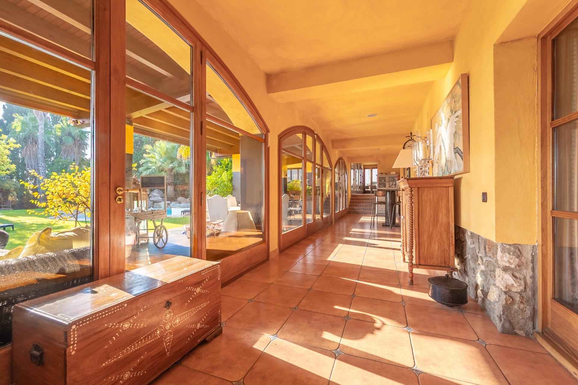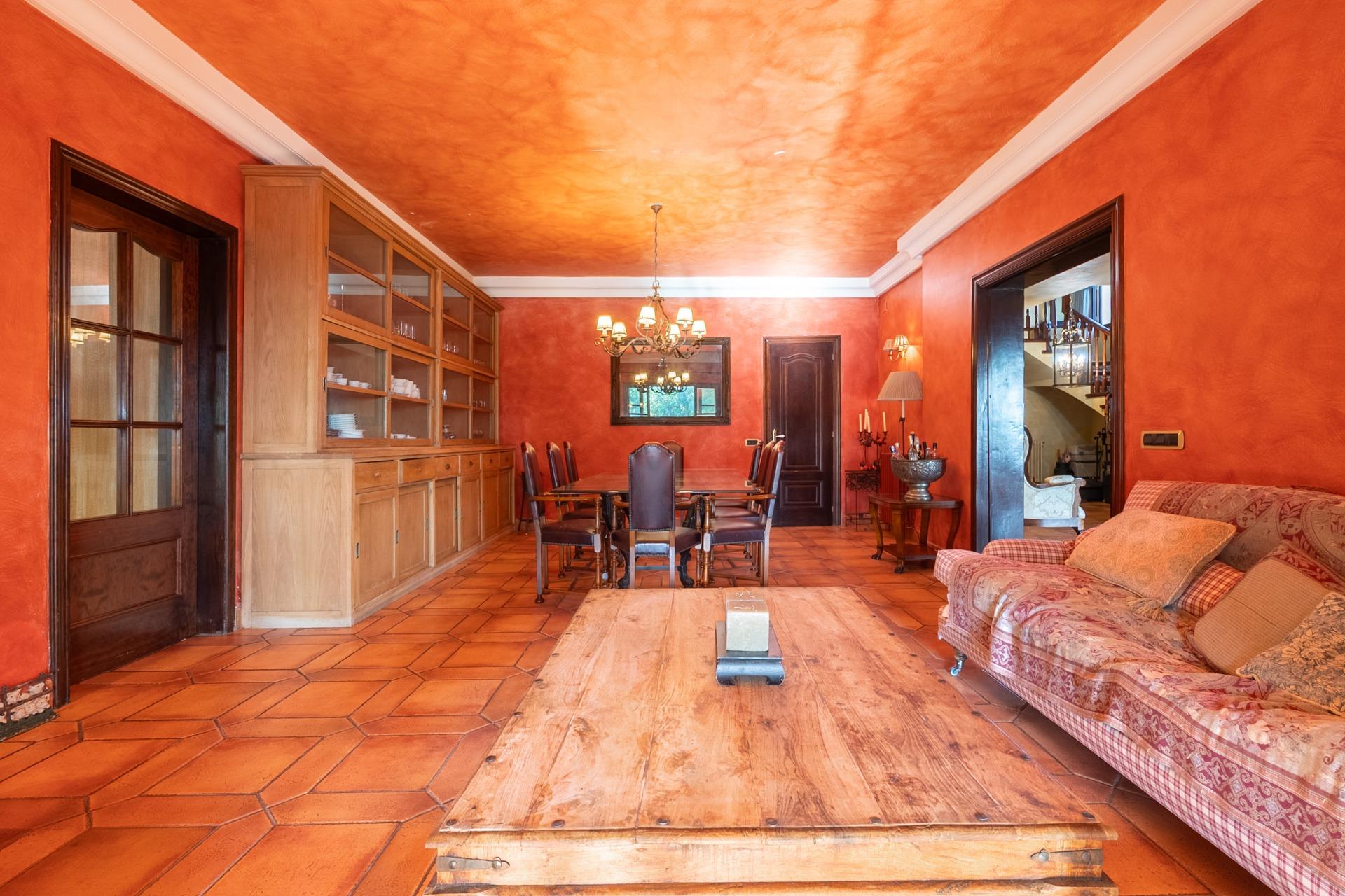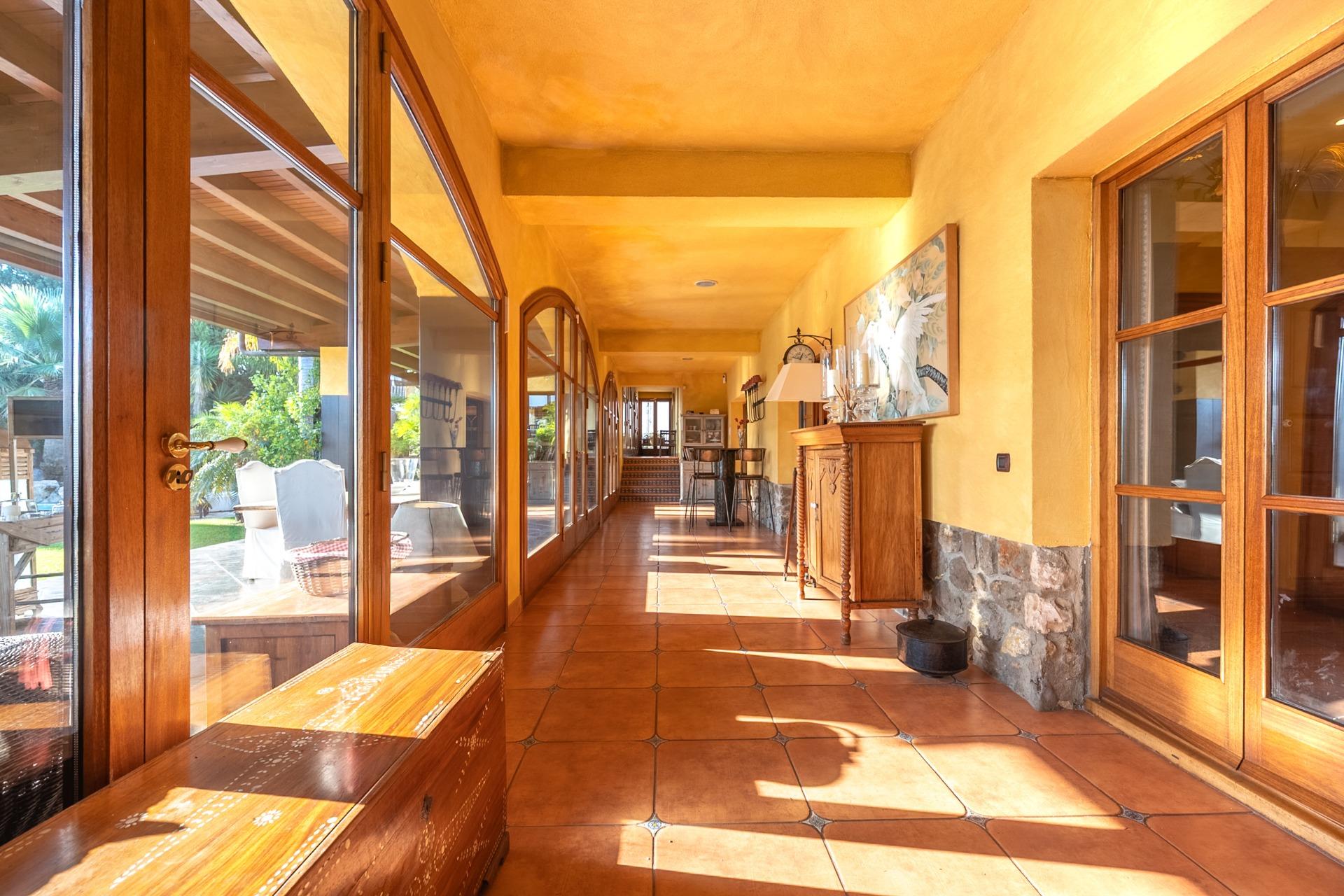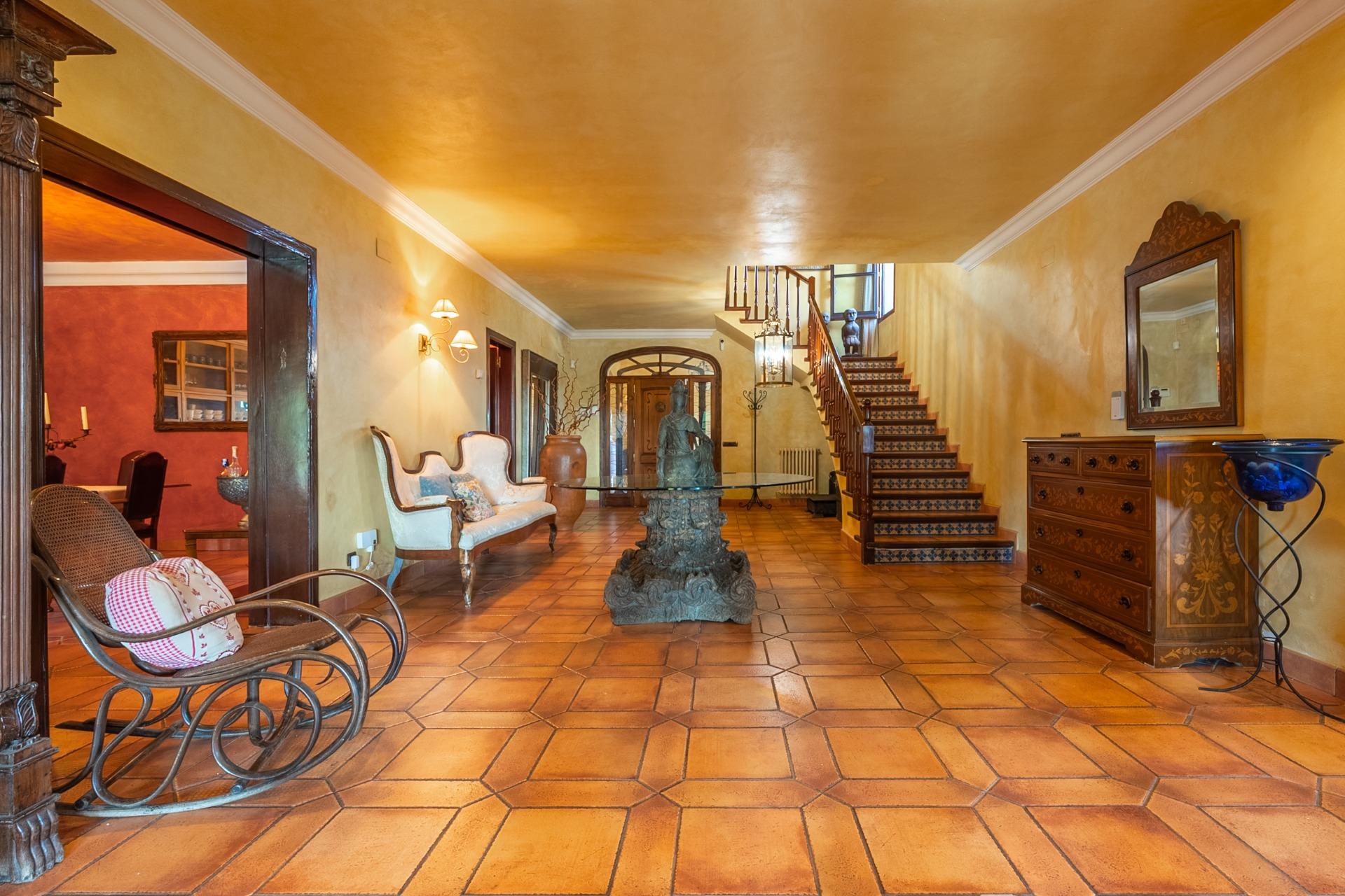 En la planta principal, un amplio hall da la bienvenida y conecta con un gran salón biblioteca, un comedor de 100 m² y una espaciosa cocina de 100 m². En esta misma planta se encuentra un segundo salón con chimenea y billar, así como un fantástico porche con zonas de comedor, estar y chill-out. Además, dispone de un comedor de verano acristalado con vistas al jardín.