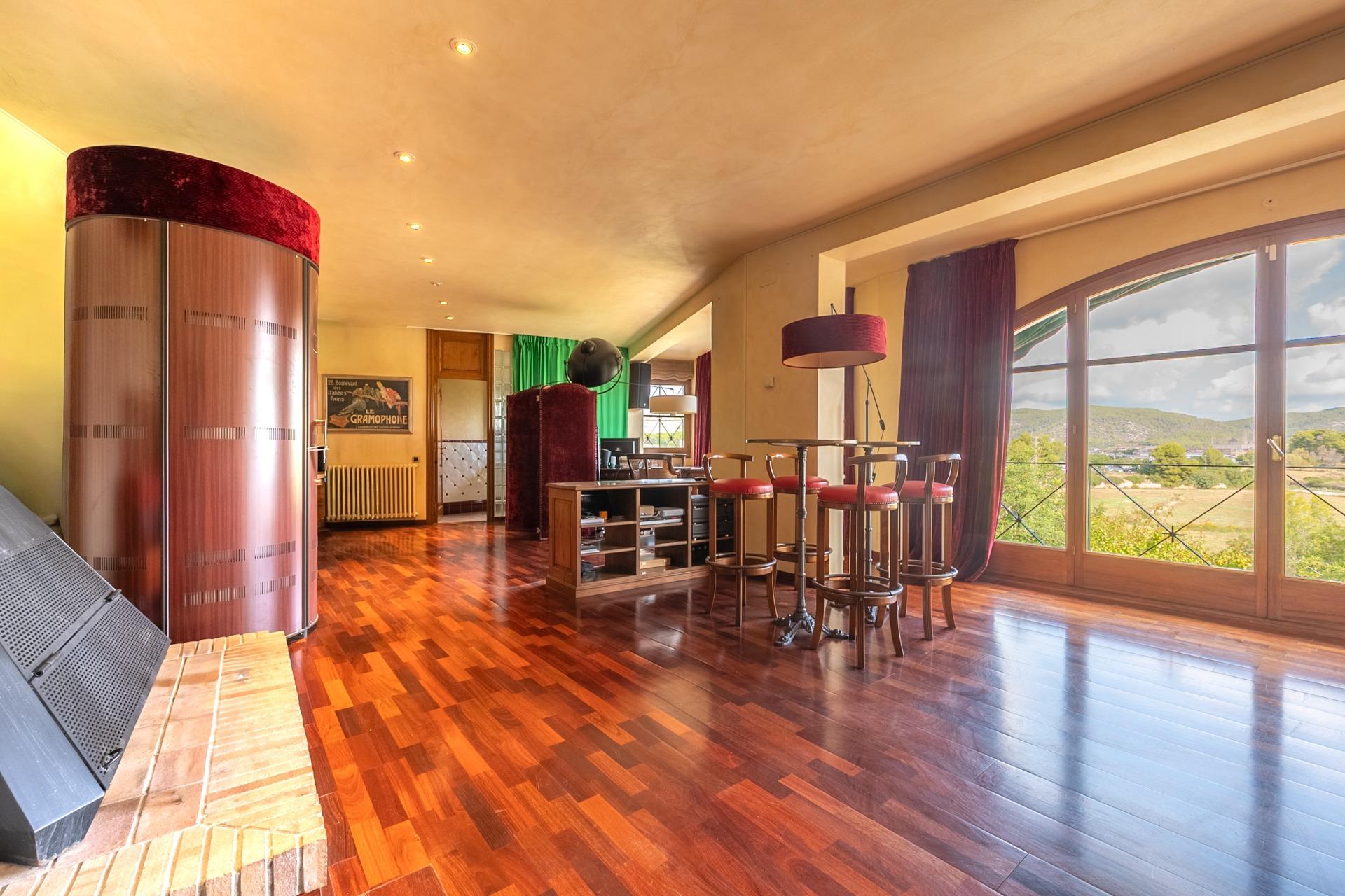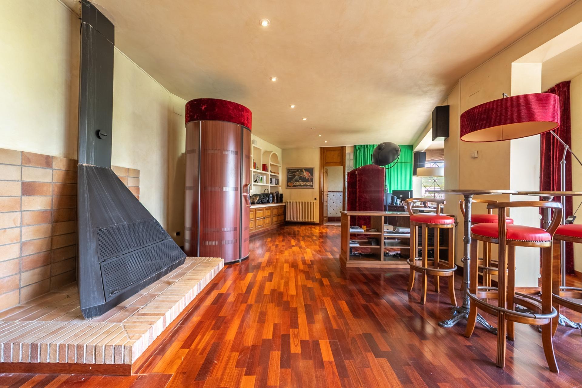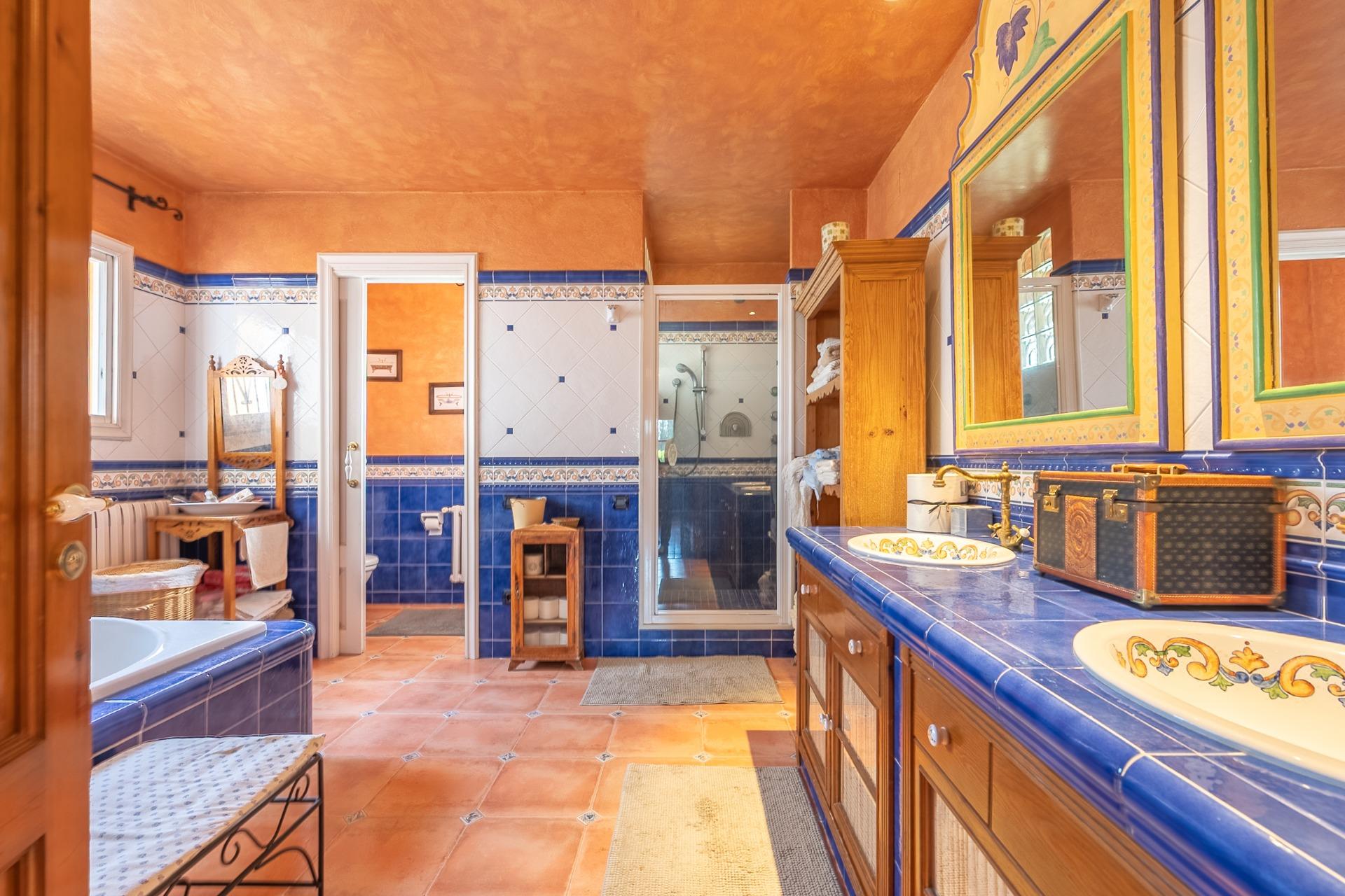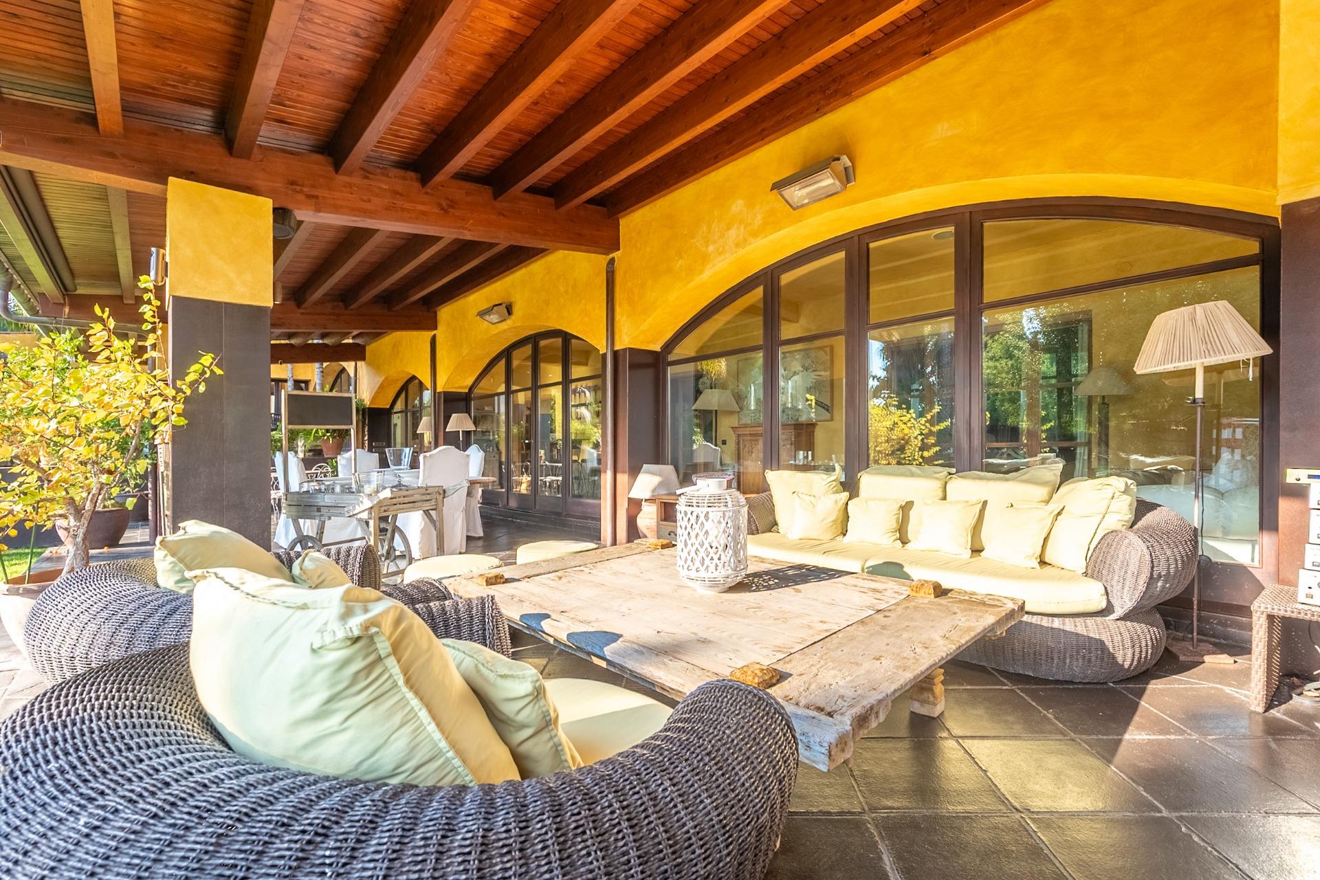 En la planta principal, un amplio hall da la bienvenida y conecta con un gran salón biblioteca, un comedor de 100 m² y una espaciosa cocina de 100 m². En esta misma planta se encuentra un segundo salón con chimenea y billar, así como un fantástico porche con zonas de comedor, estar y chill-out. Además, dispone de un comedor de verano acristalado con vistas al jardín.