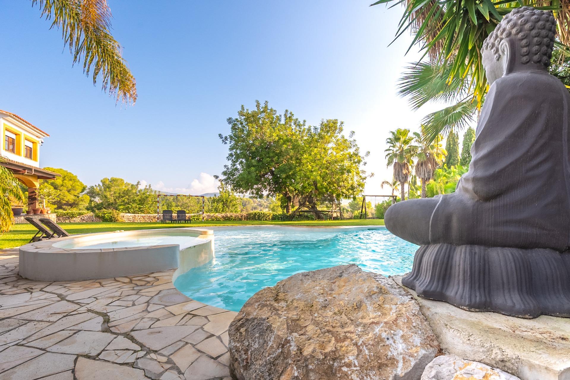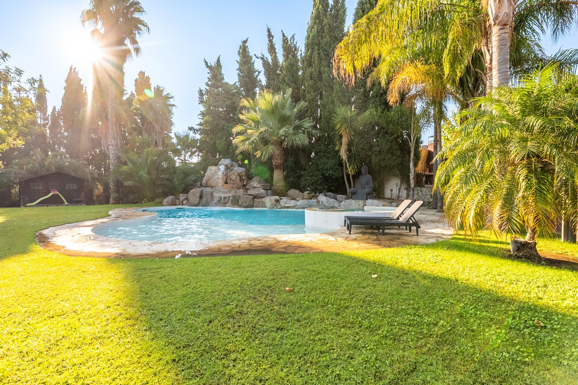 El jardín, meticulosamente cuidado, cuenta con una espectacular piscina que simula un lago con cascada, creando un entorno natural y relajante.